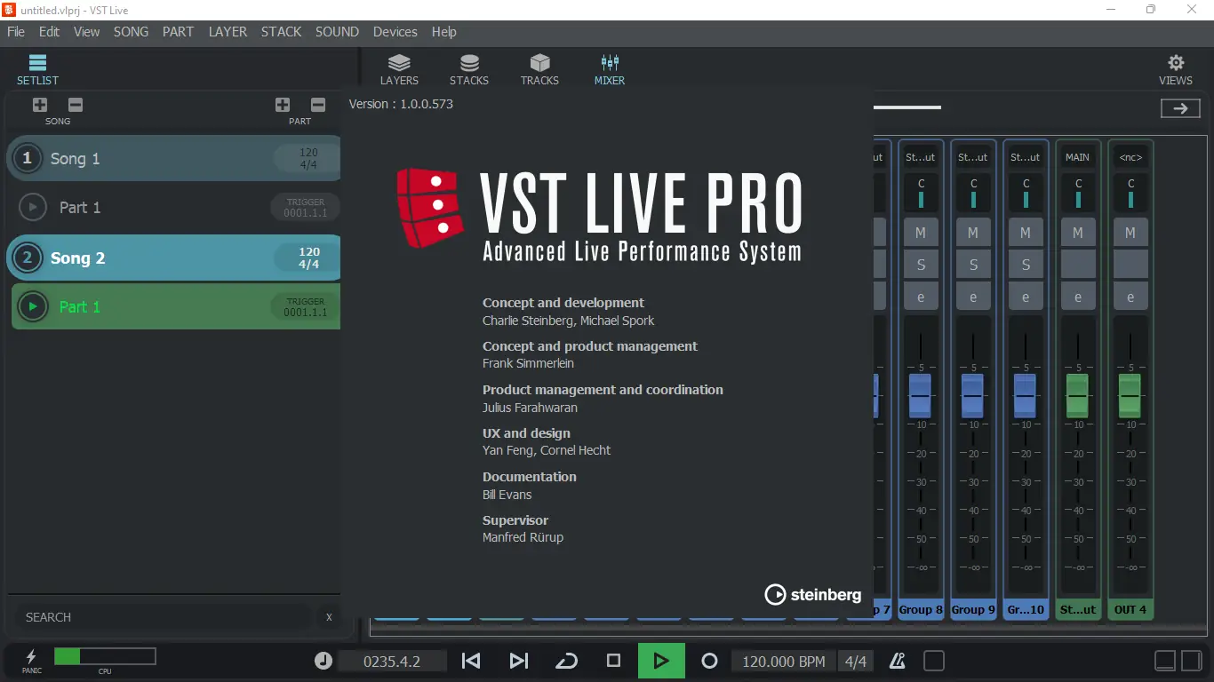Steinberg VST Live — это программное решение для организации живых выступлений с полным контролем над звуком, светом и видео. Программа подходит как для сольных музыкантов, так и для групп, обеспечивая стабильную работу на сцене без сбоев. С её помощью можно синхронизировать аудио, управлять текстами песен и аккордами, подключать MIDI-устройства и настраивать освещение через DMX.