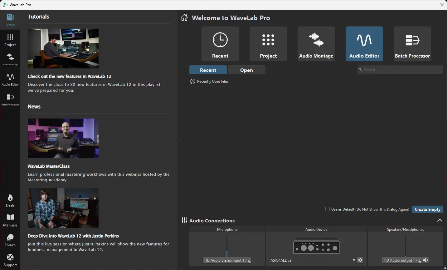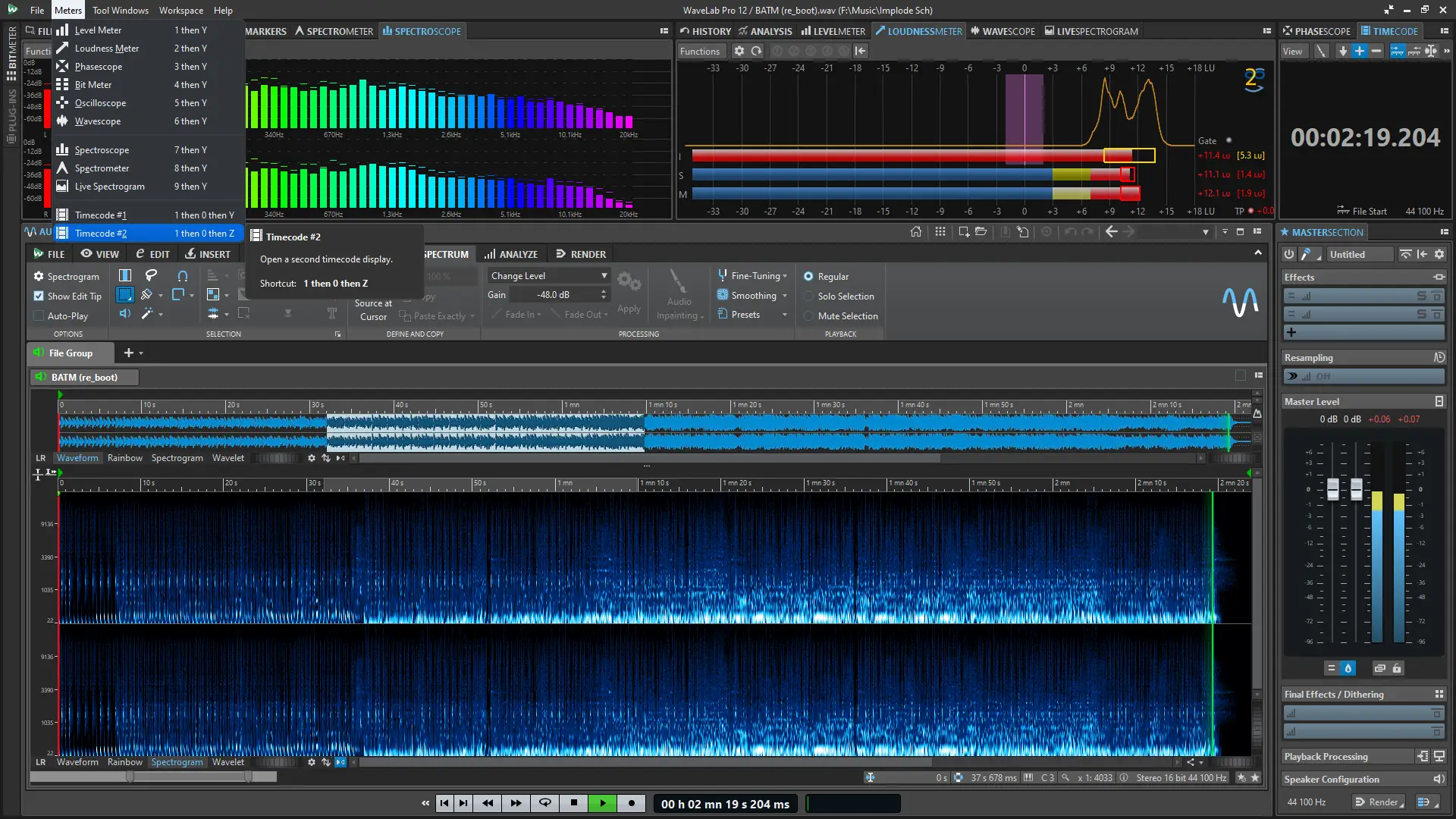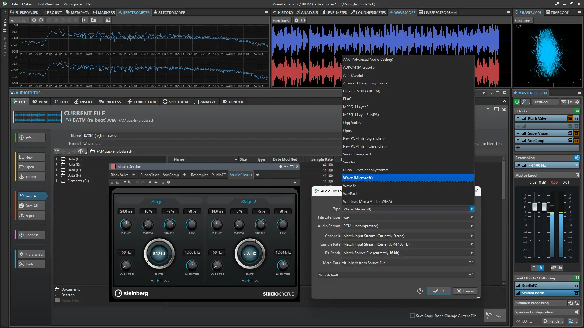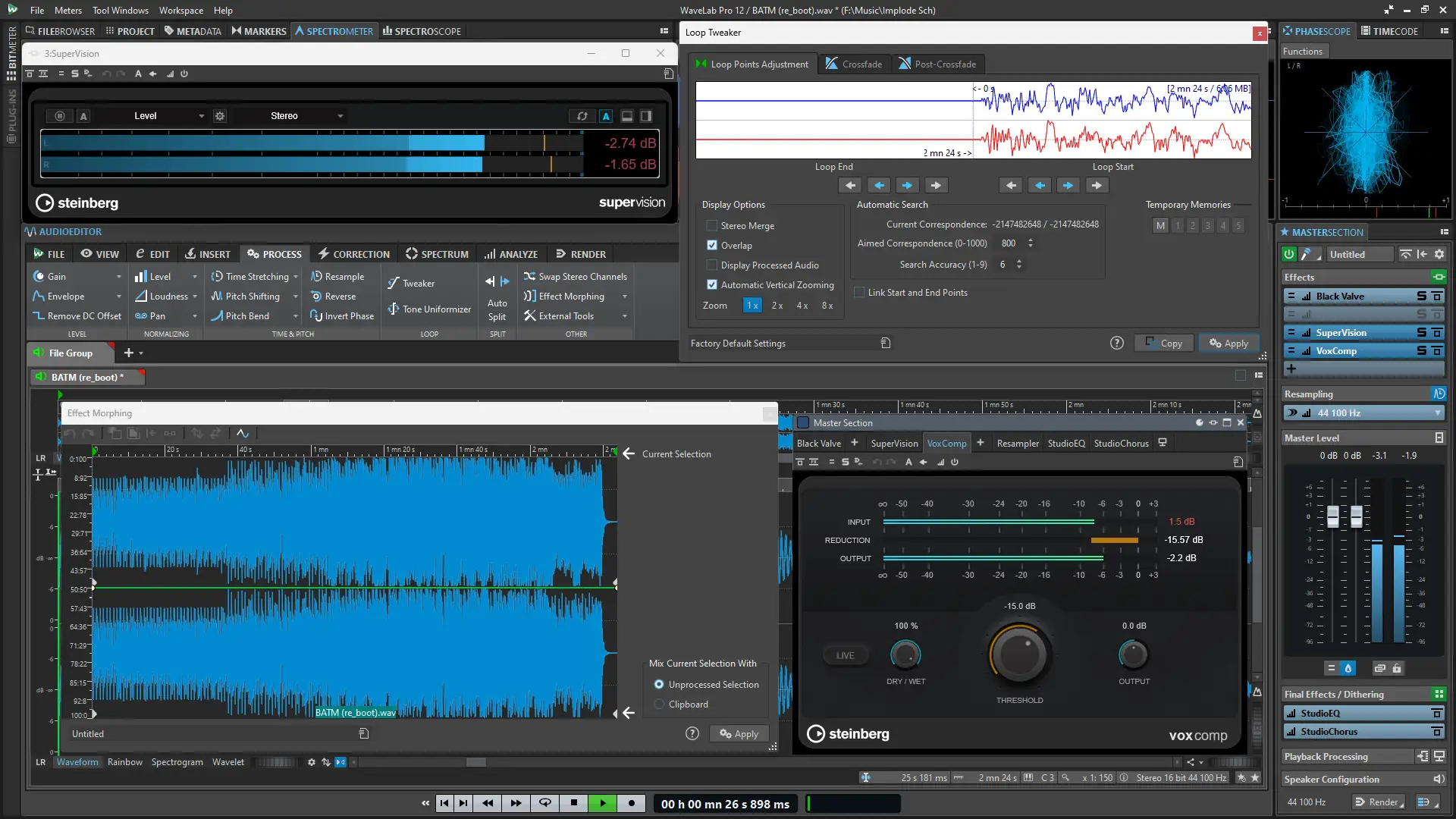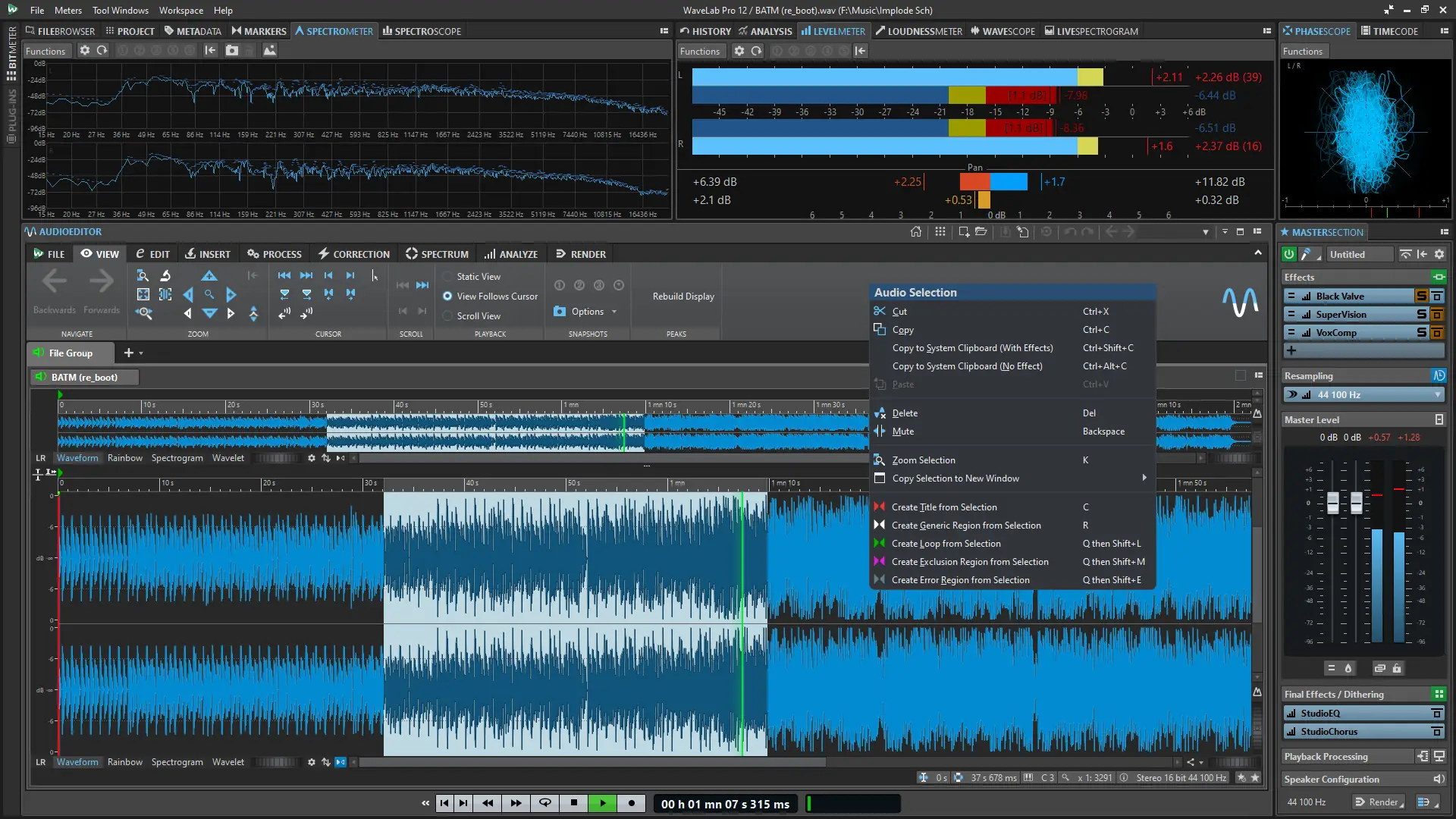Работа с WaveLab начинается с создания аудиомонтажа или открытия отдельного файла в Audio File Editor. Интерфейс поддерживает одновременное отображение нескольких форм представления сигнала: волновая форма, спектрограмма, осциллограмма. Пользователь может настраивать цепочки эффектов в Master Section, применять лимитеры, эквалайзеры и деземфазеры. Благодаря автоматическому сопоставлению громкости референсных дорожек и выходного сигнала, легко проводить A/B-сравнение. Для ускорения обработки доступна пакетная конвертация с сохранением пользовательских пресетов именования файлов.