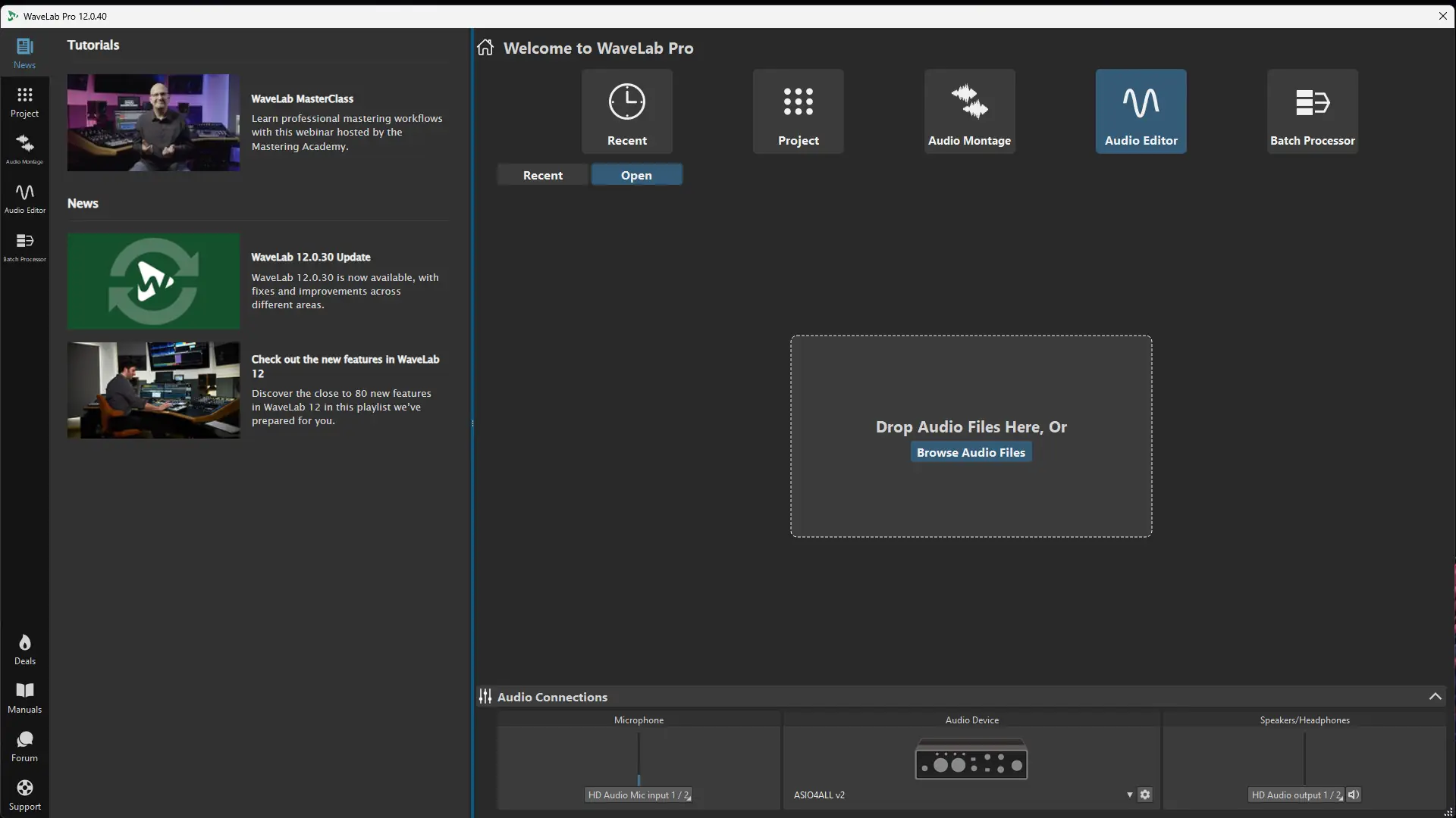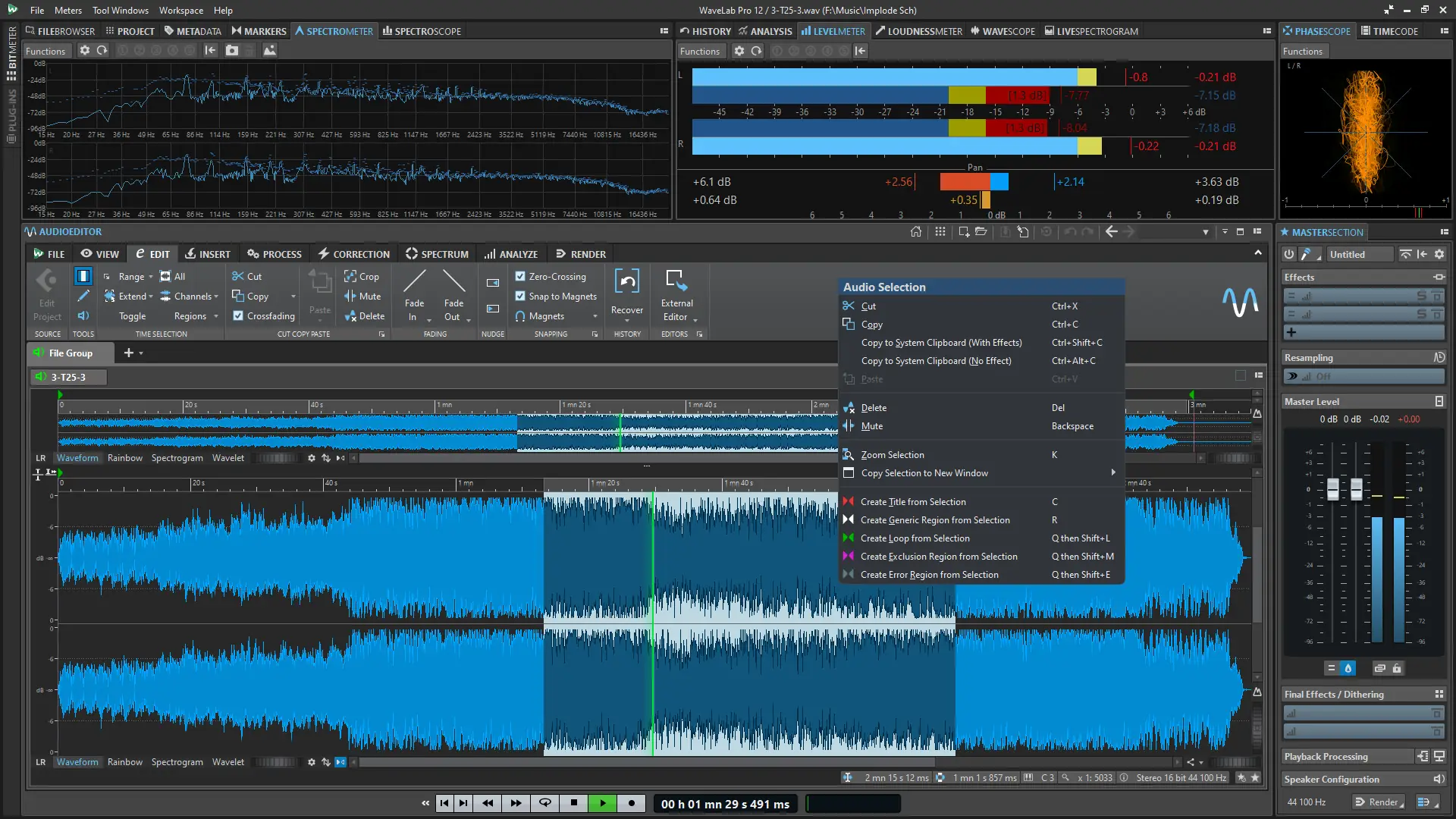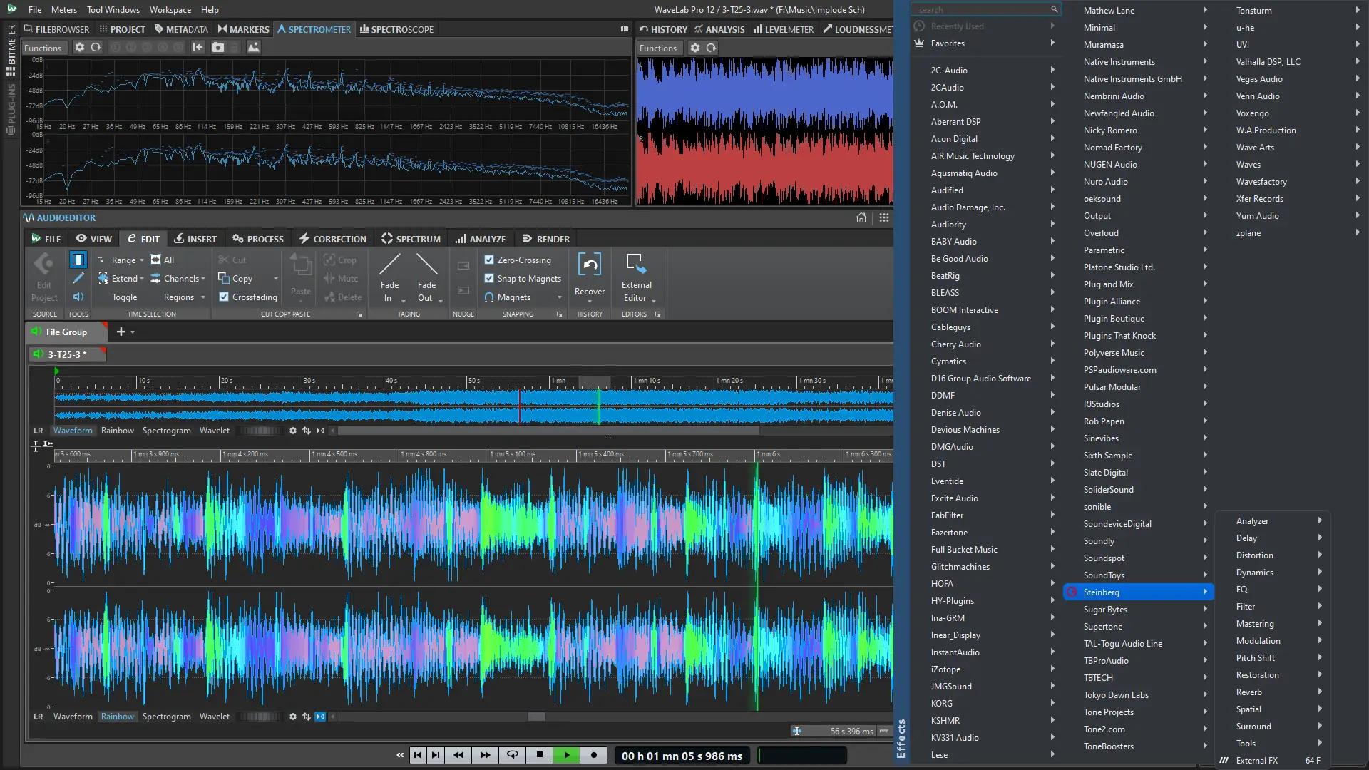 Работа с WaveLab начинается с создания аудиомонтажа или открытия отдельного аудиофайла в соответствующей среде. Интерфейс разделён на зоны: браузер файлов, форма волны, панель инструментов и шкала меток, что обеспечивает удобную навигацию и точное редактирование. Пользователи могут применять эффекты в реальном времени через VST 3-плагины, а также использовать офлайн-процессоры для преобразования звука без нагрузки на процессор.
