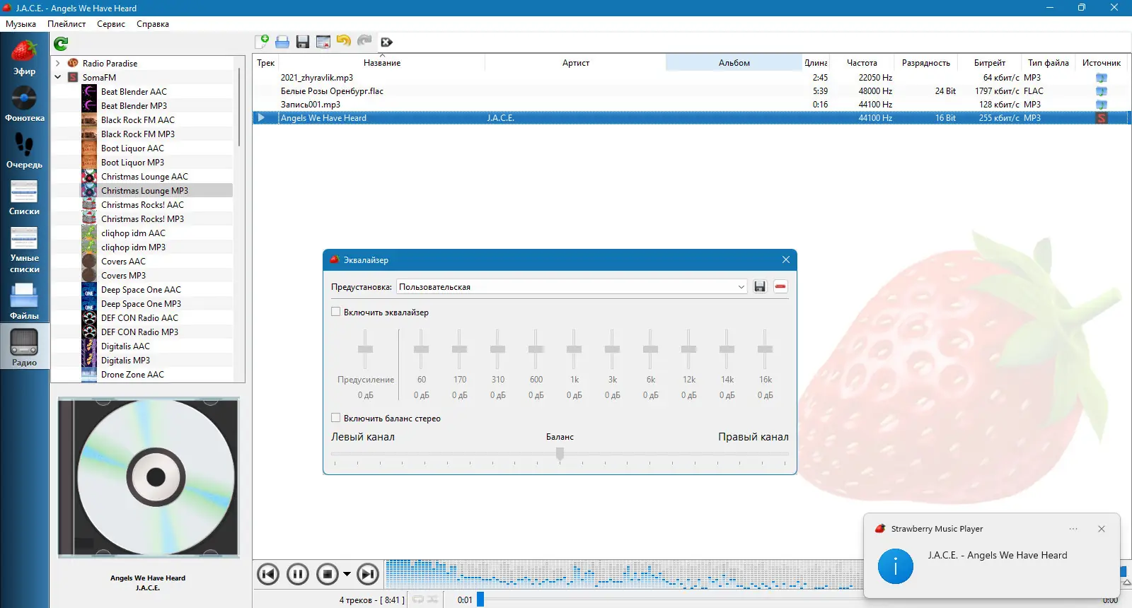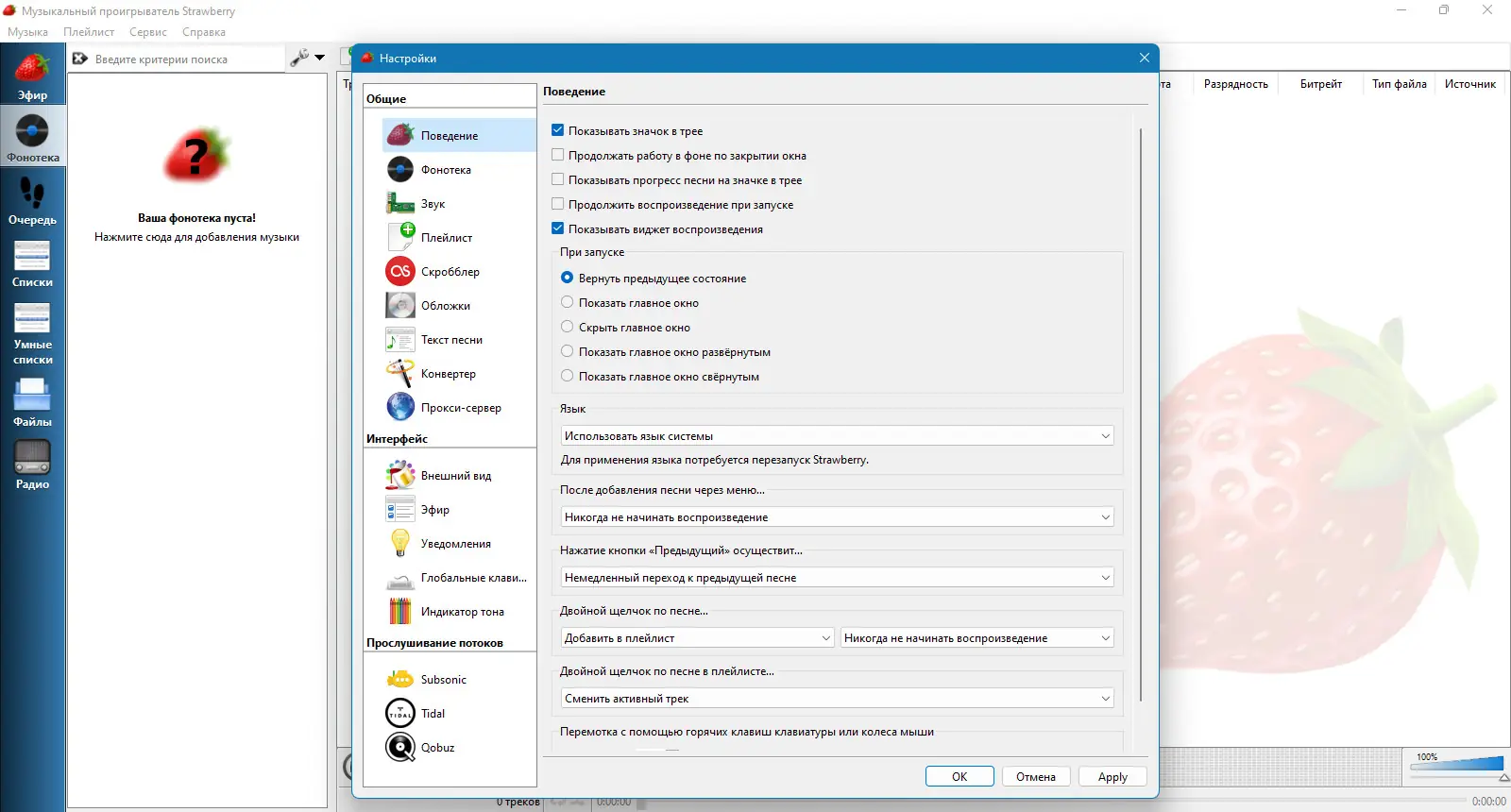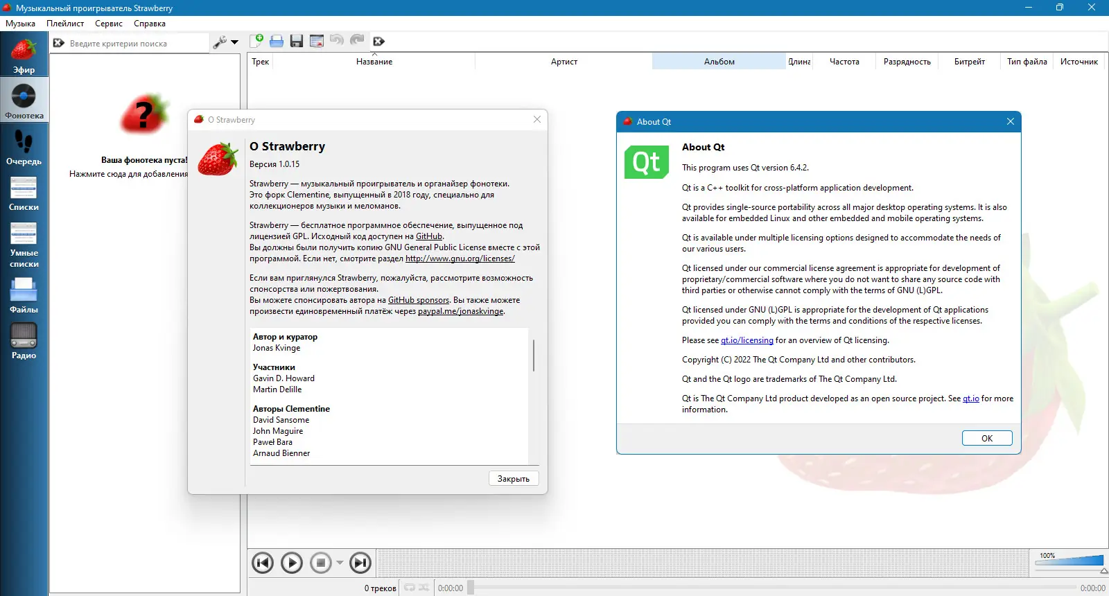 Strawberry — это музыкальный проигрыватель и менеджер аудио-коллекций, созданный для ценителей качественного звука и организованного хранения музыки. Программа, основанная на коде Clementine, предлагает расширенные функции воспроизведения, поддержку множества форматов и интеграцию с популярными музыкальными сервисами. С Strawberry пользователь получает полный контроль над своей библиотекой, включая тегирование, обложки, тексты песен и потоковое вещание.