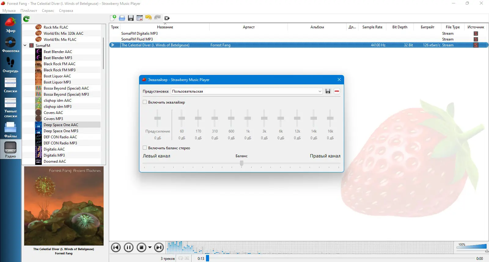 После установки Strawberry автоматически сканирует указанные каталоги на наличие музыкальных файлов. Пользователь может добавлять папки с музыкой, создавать плейлисты и организовывать композиции по исполнителям, альбомам или жанрам. Интерфейс интуитивно понятен: библиотека отображается в левой панели, а текущая очередь воспроизведения — в нижней части окна. Для настройки звука доступны эквалайзер и аудиоанализатор, а также возможность выбора устройства вывода и буфера воспроизведения. Скробблинг на Last.fm и ListenBrainz включается в настройках и работает в фоновом режиме.