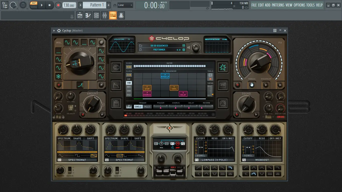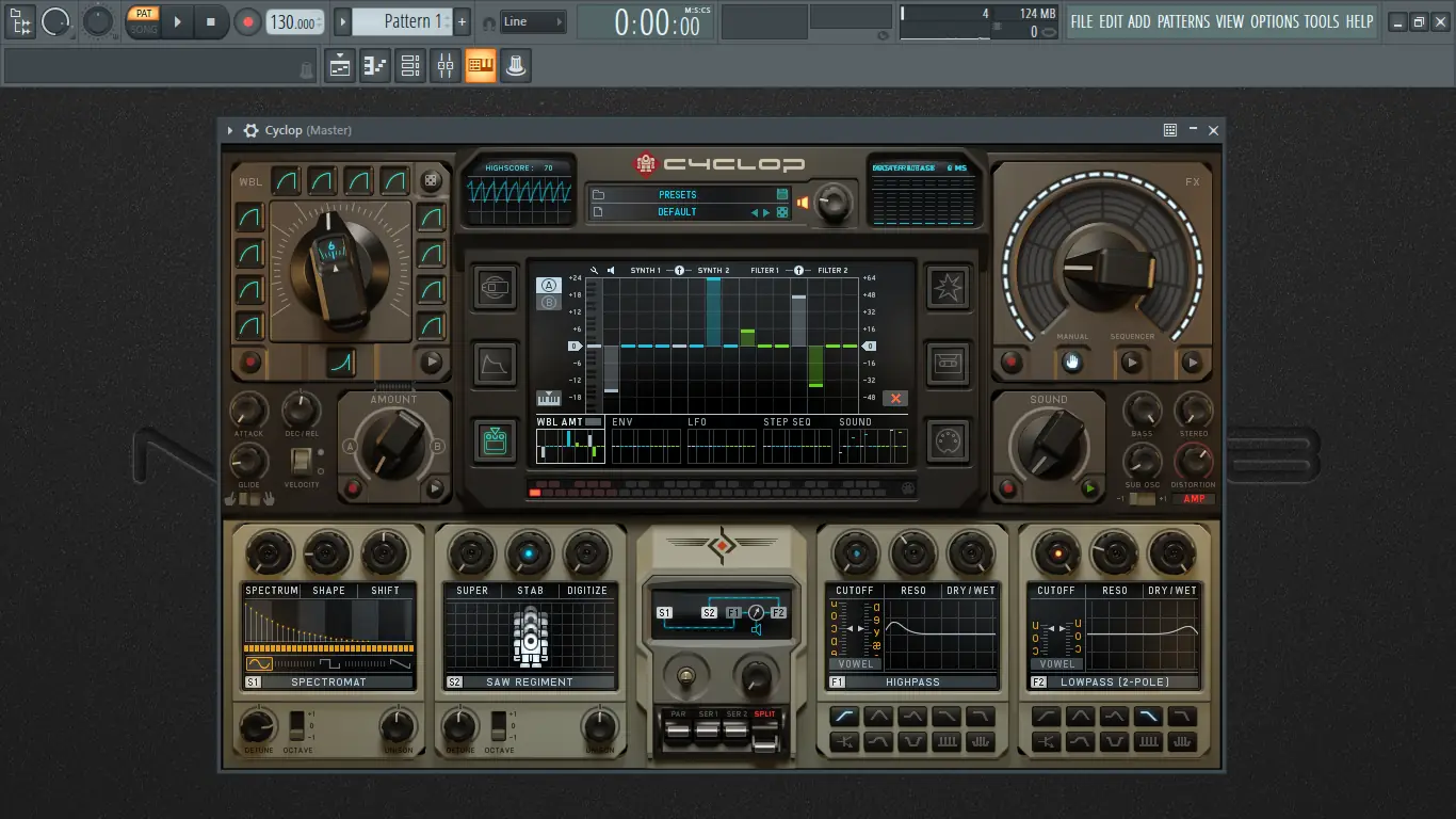 Работа с Cyclop начинается с выбора режима синтеза и настройки осцилляторов. Пользователь может активировать Wobble Knob для автоматической модуляции фильтра и синтеза с темповой синхронизацией, задавая ритмические изменения в звуке. Ручной рекордер позволяет записывать движения параметров в реальном времени, привязывая их к MIDI-нотам для динамичного исполнения.