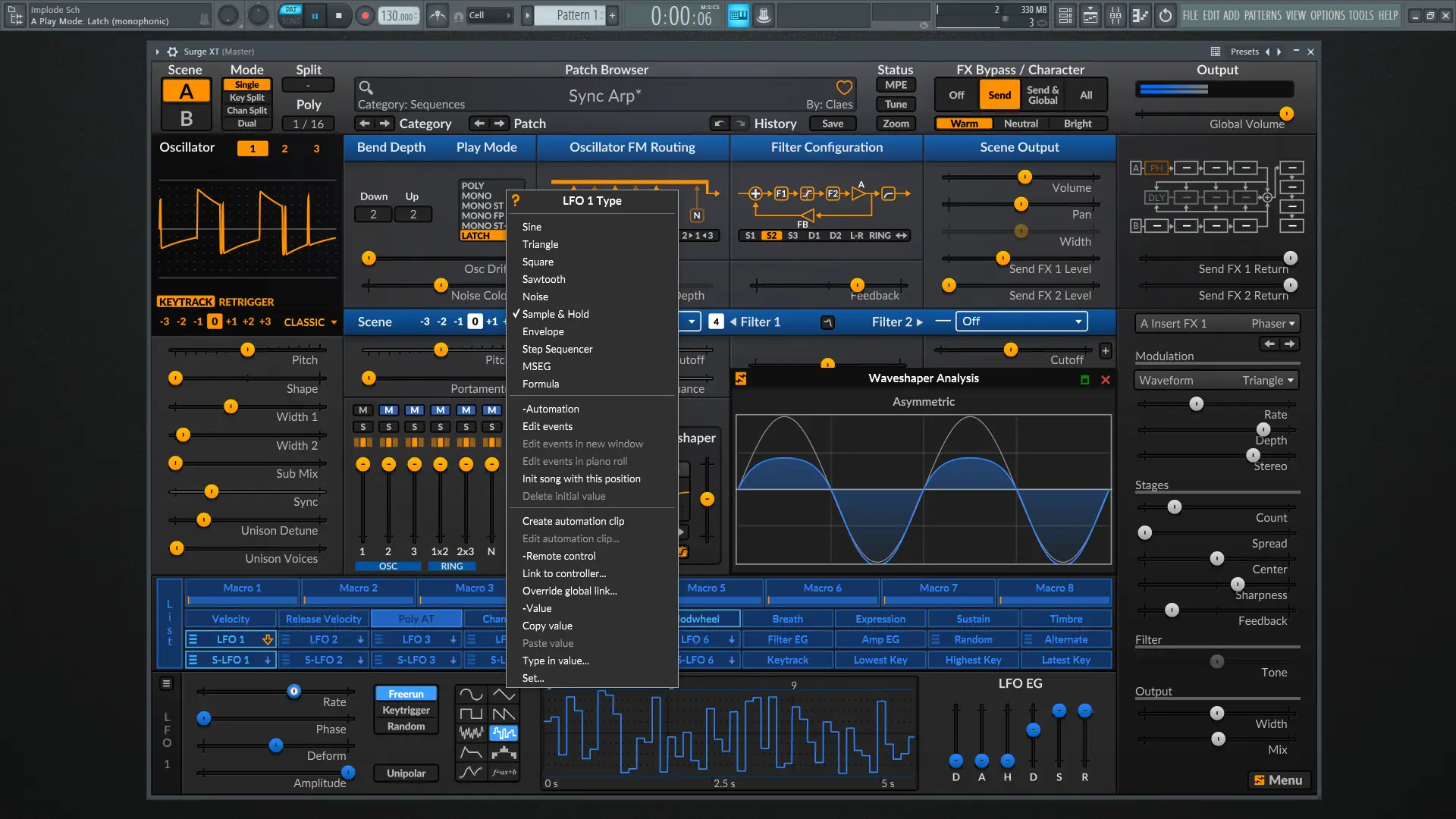 - Три осциллятора на сцену с 12 алгоритмами, включая классические, wavetable, FM и специализированные типы, такие как String и Twist