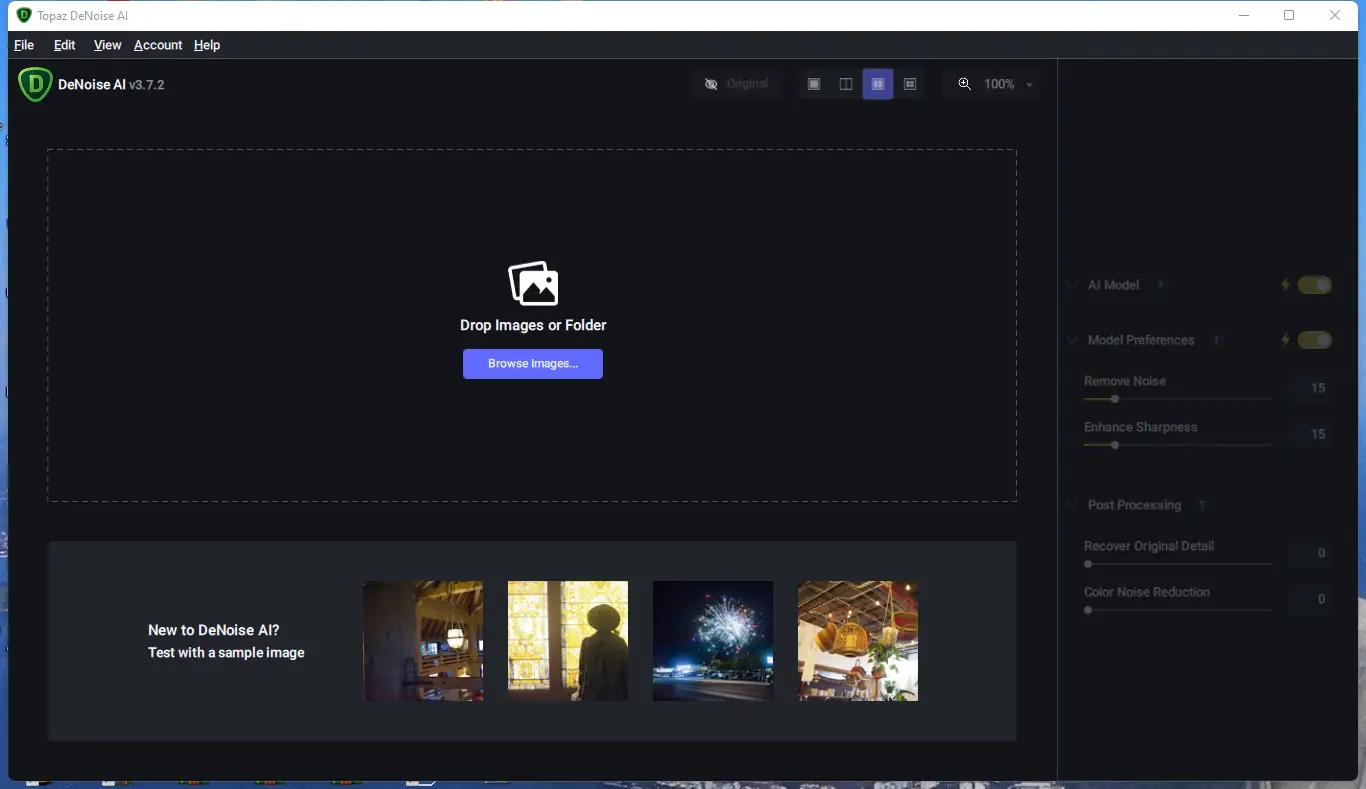 Программа предлагает интуитивно понятный интерфейс, позволяющий быстро приступить к обработке. После запуска изображения можно использовать автоматический режим, который подберёт оптимальные параметры шумоподавления. Для более точной настройки доступны ползунки, регулирующие интенсивность обработки, сохранение деталей и тоновую коррекцию. Также поддерживается работа через пресеты, которые позволяют сохранять и применять настройки для серий снимков. Благодаря клавишам быстрого доступа и возможности двойного клика для сброса параметров, рабочий процесс становится максимально комфортным.