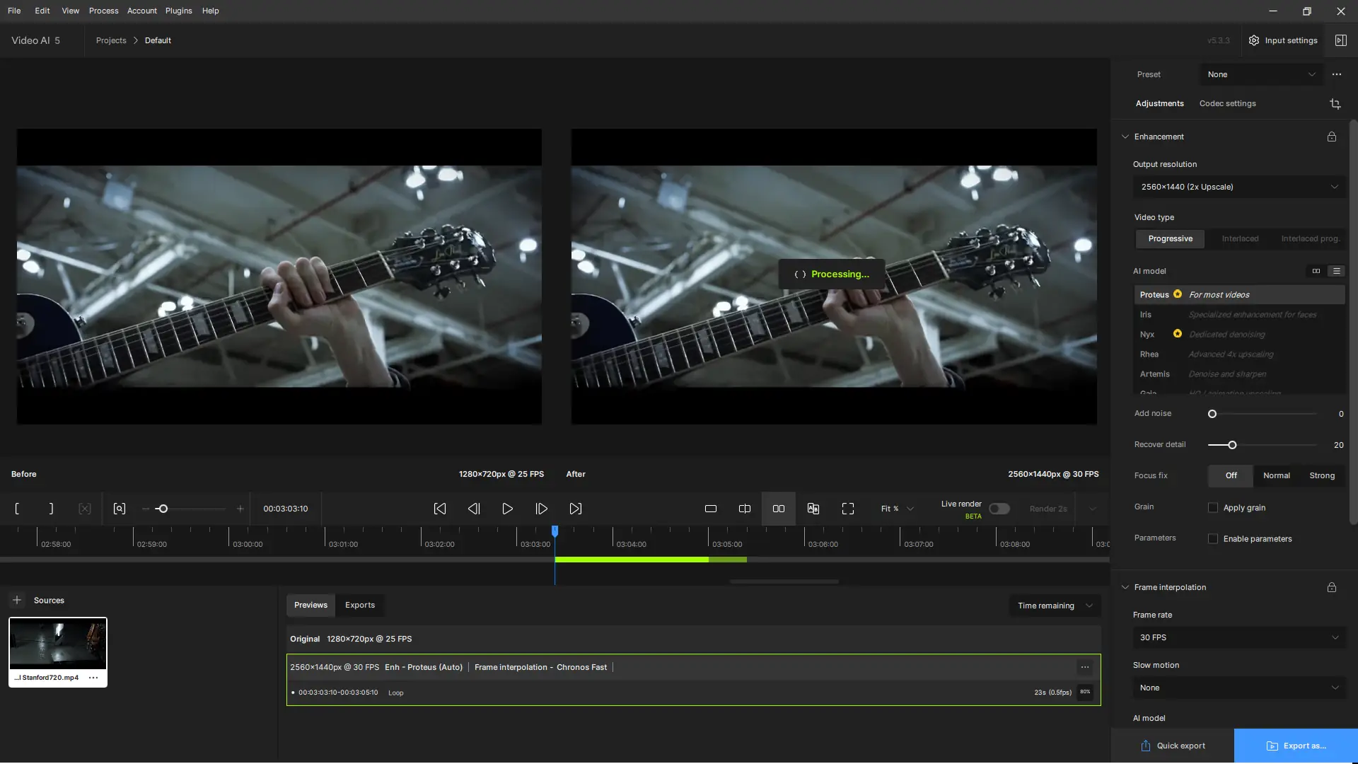 Работа с программой начинается с загрузки видеофайла через интерфейс. Далее пользователь выбирает модель обработки в зависимости от типа контента — например, для анимации, фильмов или игровых записей. После настройки параметров вывода, таких как разрешение и частота кадров, запускается процесс рендеринга, который преобразует видео с учётом анализа соседних кадров и восстановления текстур.