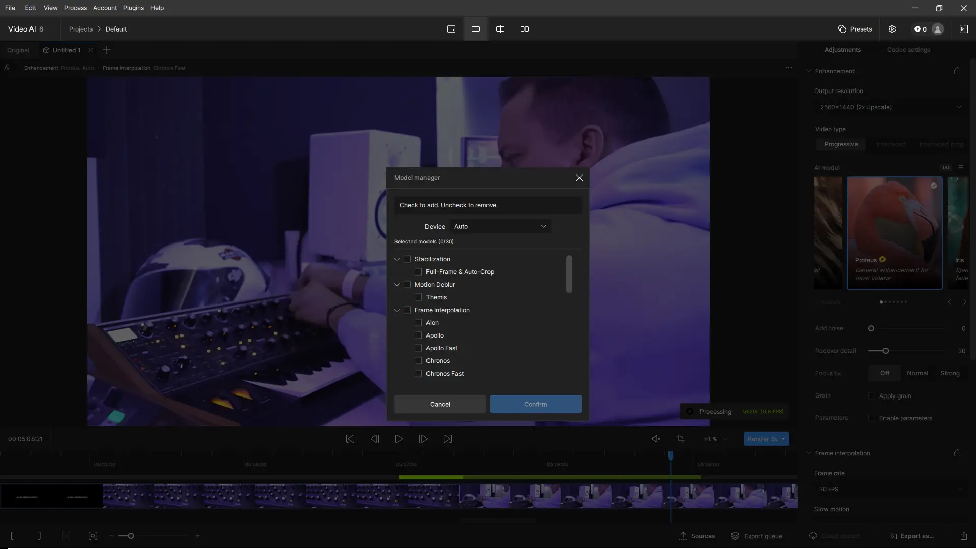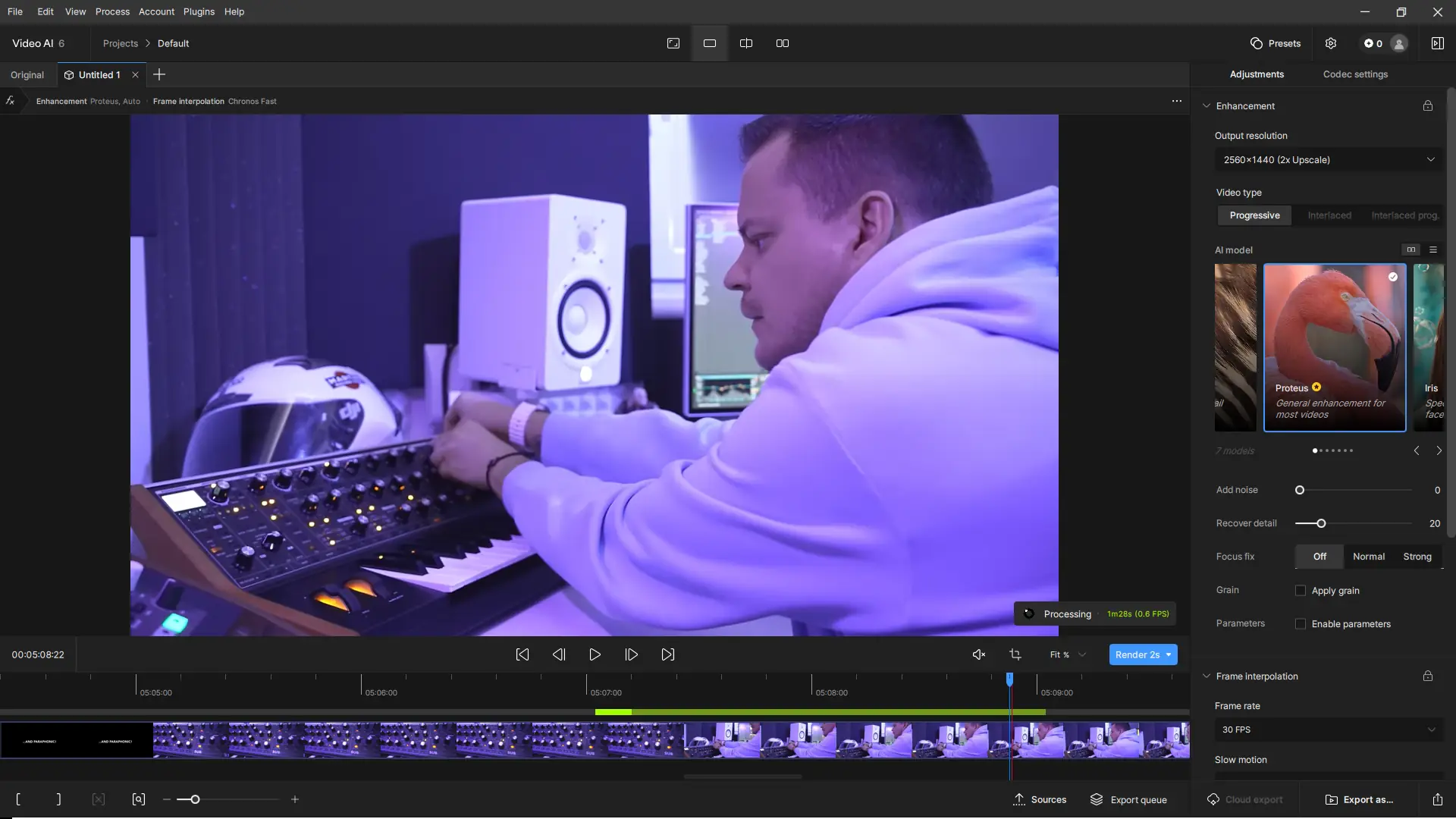 Интерфейс Topaz Video AI интуитивно понятен и не требует специальных навыков. Достаточно загрузить видеофайл, выбрать целевое разрешение, настроить параметры обработки и запустить рендеринг. Процесс автоматизирован, но предоставляет доступ к тонкой настройке: можно регулировать степень шарпинга, уровень шумоподавления и тип движущихся объектов. После завершения обработки результат сохраняется в выбранном формате с высоким битрейтом.