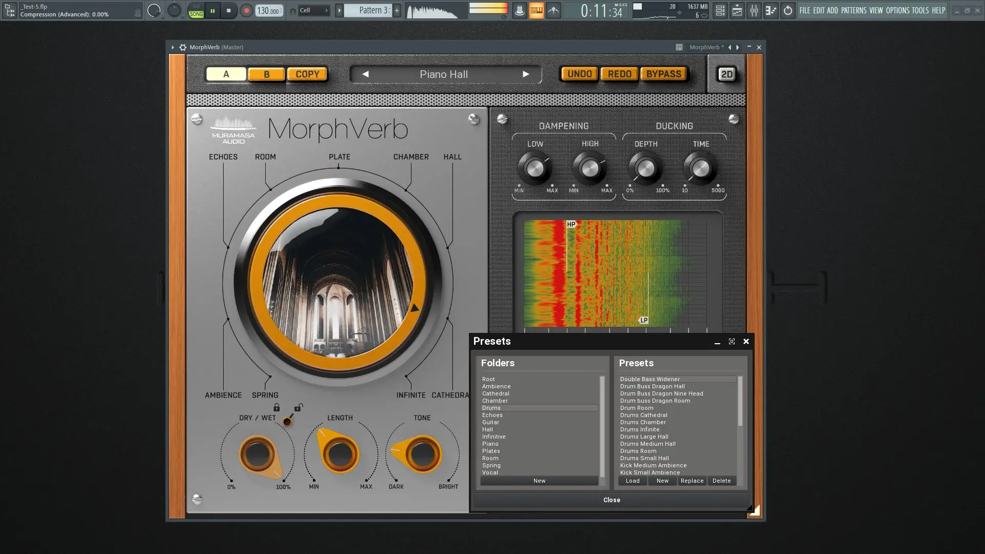Использование MorphVerb интуитивно понятно благодаря продуманному интерфейсу. После установки плагина его можно загрузить на любой дорожке цифровой аудио-рабочей станции. Основной элемент управления — это круговой селектор, позволяющий выбирать и микшировать типы реверберации. Регулировка параметров, таких как предварительная задержка, ширина стерео-картины, размер помещения и демпинг, осуществляется с помощью ползунков. Фильтры HiPass и LoPass можно перемещать прямо на спектрограмме, визуально контролируя частотный диапазон реверберации. Функция ducking активируется отдельно и реагирует на уровень входного сигнала, автоматически уменьшая интенсивность реверберации при появлении основного звука. Для быстрой настройки доступна библиотека пресетов, организованных по жанрам и применению.