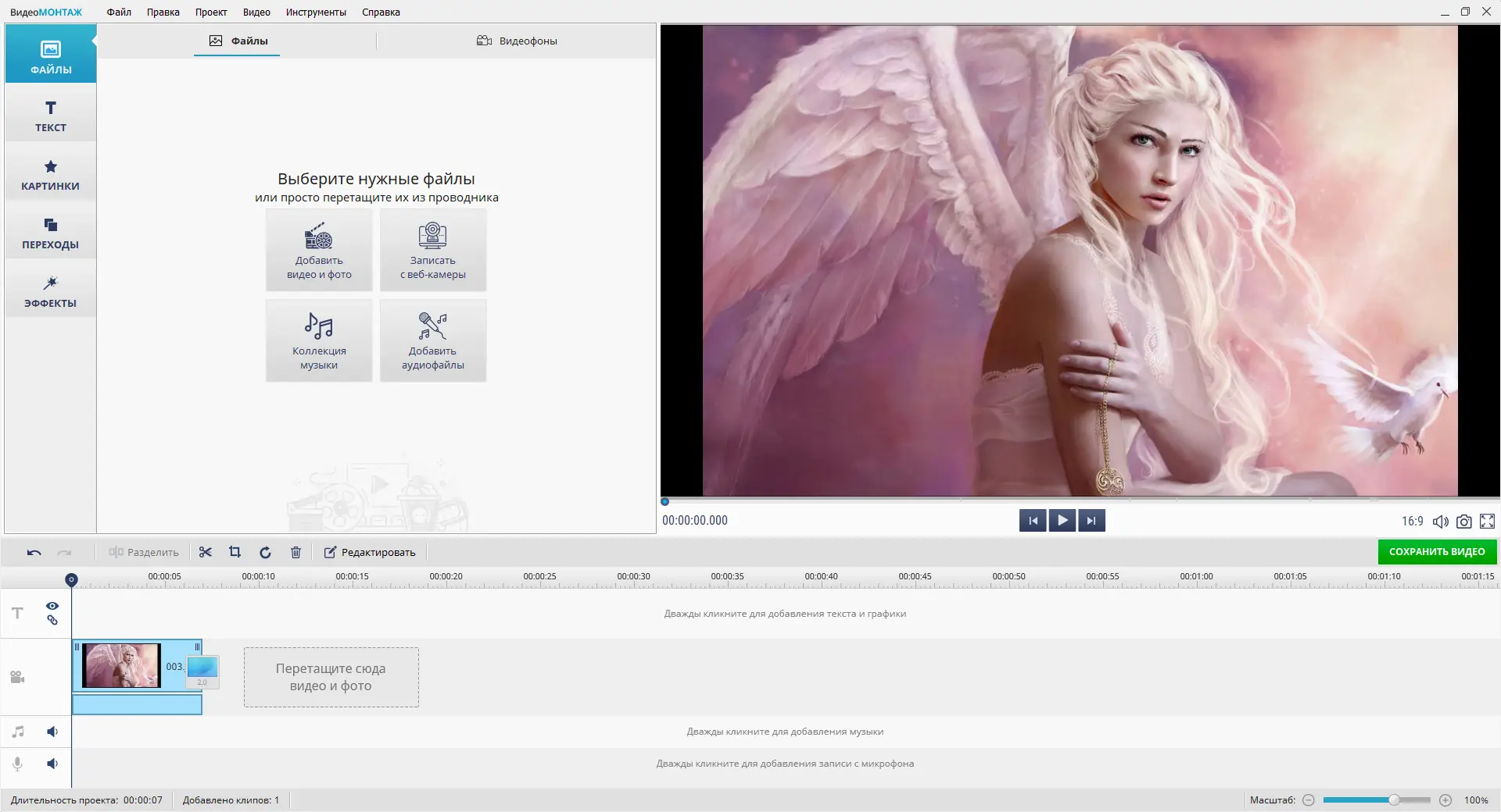 ВидеоМОНТАЖ — это простой и мощный видеоредактор, который позволяет создавать качественные видеоролики за несколько минут. Программа подходит как для начинающих, так и для пользователей без опыта монтажа. С её помощью можно объединять клипы, добавлять эффекты, музыку и титры, а также экспортировать результат в популярные форматы.