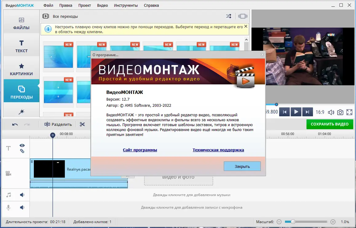ВидеоМОНТАЖ сочетает в себе простоту использования и профессиональные возможности редактирования.