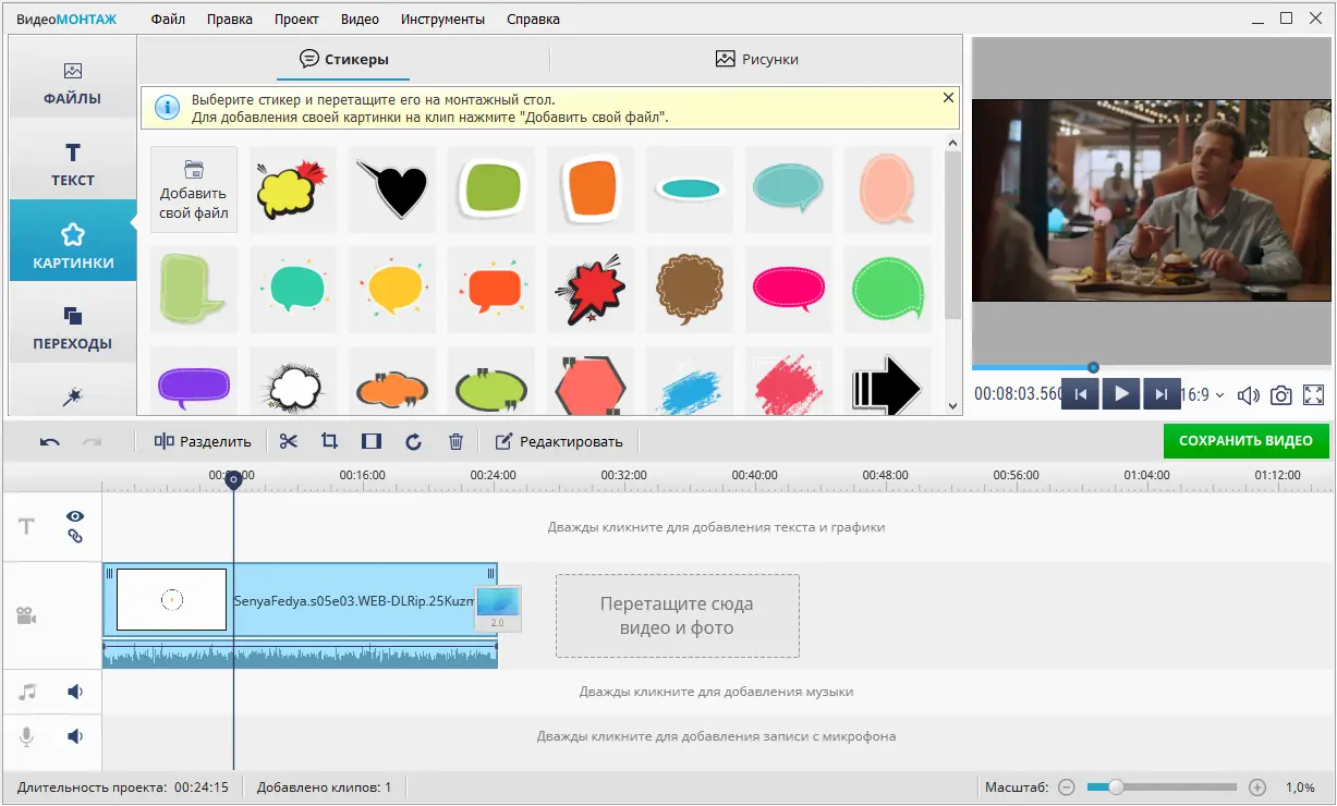 ВидеоМОНТАЖ — это простой и мощный видеоредактор, предназначенный для быстрого создания качественных видео с эффектами, титрами, музыкой и плавными переходами. Программа подходит как для новичков, так и для пользователей с минимальным опытом монтажа, позволяя за несколько шагов превратить обычные фото и видеозаписи в готовый фильм. Интерфейс полностью на русском языке, а поддержка множества форматов делает процесс редактирования максимально гибким и удобным.