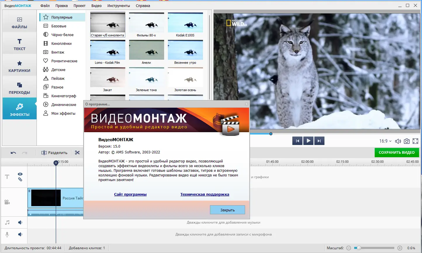 ВидеоМОНТАЖ сочетает в себе простоту использования и профессиональные возможности редактирования.
