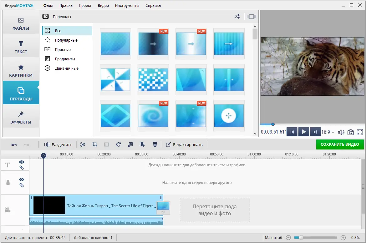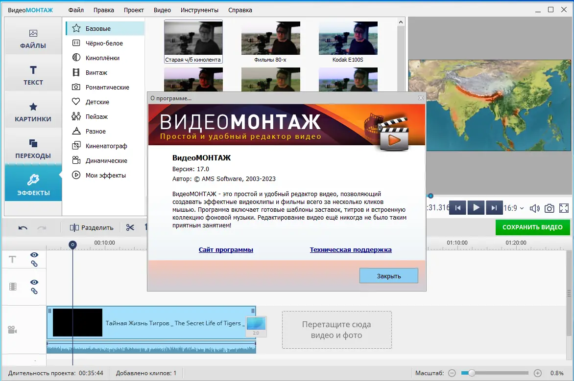 ВидеоМОНТАЖ — это простой и мощный видеоредактор, который позволяет создавать качественные видео с эффектами, переходами, титрами и музыкой всего за несколько шагов. Программа подходит как для новичков, так и для пользователей с минимальными навыками монтажа. С её помощью можно быстро собрать фильм из фото и видео, добавить фоновую музыку и экспортировать результат в нужный формат.