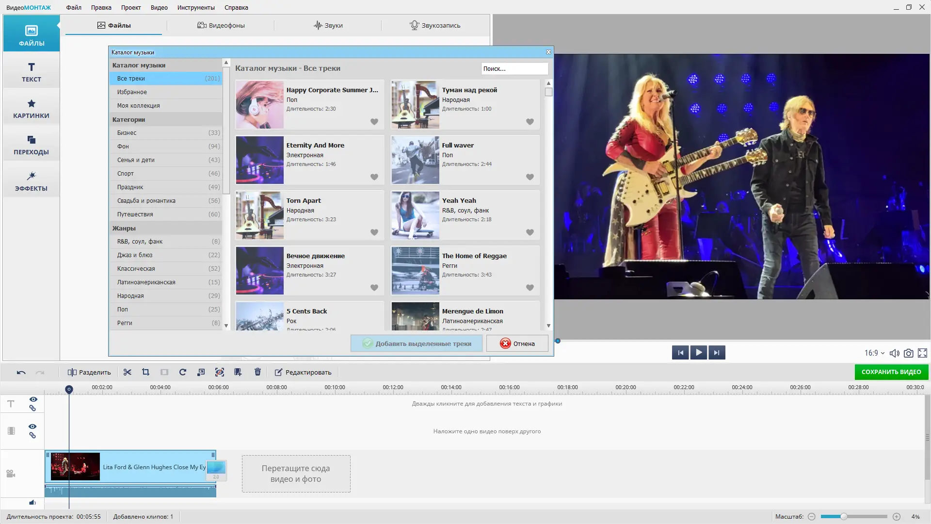 - Добавление фоновой музыки из встроенной коллекции или внешних источников