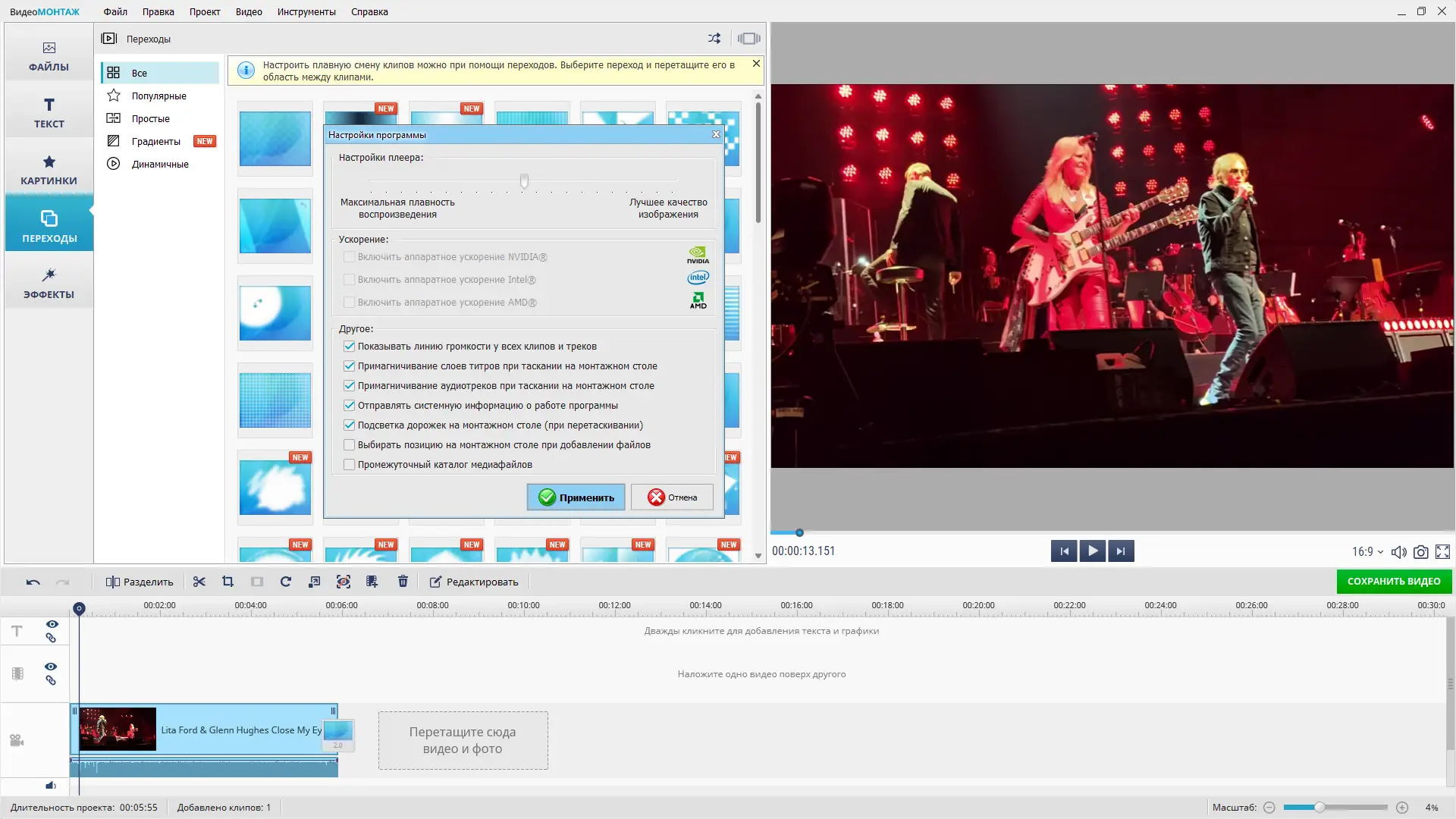 - Экспорт в форматах, оптимизированных для YouTube, VK, Facebook и мобильных устройств
