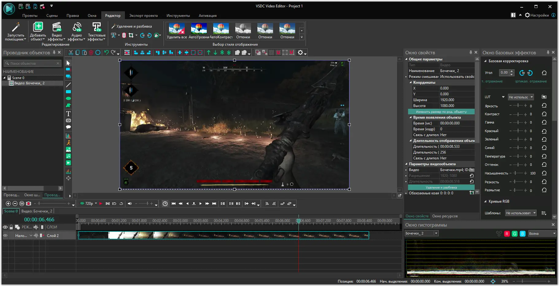 Интерфейс VSDC Video Editor интуитивно понятен, несмотря на насыщенность функциями. После добавления медиафайлов на таймлайн можно применять переходы, эффекты и корректировать цвет в несколько этапов. Работа с LUT-таблицами позволяет быстро менять цветовую гамму, а пользовательские горячие клавиши ускоряют выполнение часто используемых операций. Тримминг осуществляется захватом края объекта, что делает процесс точным и удобным. Визуальные подсказки и встроенные примеры помогают быстро освоить базовые приёмы монтажа.