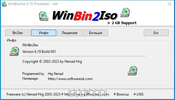 Программа доступна для бесплатного использования и распространяется в портативном виде. Её можно сохранить на флешку или жёсткий диск и запускать на любом компьютере под управлением Windows. Утилита совместима с актуальными версиями операционной системы, включая 32- и 64-битные сборки. Вы можете скачать WinBin2Iso с официального источника, не опасаясь за вирусы или сторонние вставки.