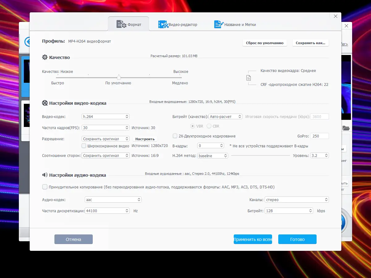 - Конвертирует видео в более чем 370 форматов и профилей устройств, включая оптимизацию под смартфоны, планшеты и телевизоры