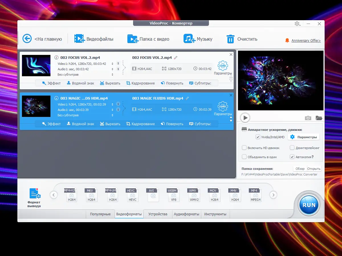 Программа сочетает в себе мощные функции и высокую стабильность, поддерживая работу с высоким разрешением, включая 4K и HEVC. Благодаря оптимизации кода и использованию GPU, даже ресурсоёмкие задачи выполняются быстро и без перегрева системы. Поддержка портативного режима позволяет запускать приложение с флеш-накопителя без установки, что удобно для мобильного использования.