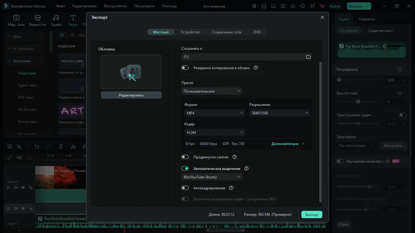 Использование Filmora начинается с импорта медиафайлов на таймлайн, где можно свободно перемещать, обрезать и комбинировать клипы. Далее доступны инструменты для наложения переходов, фильтров, титров и графических элементов, которые можно настраивать в реальном времени. Звук редактируется отдельно: можно регулировать громкость, применять эффекты, использовать функцию приглушения фоновой музыки при речи. После завершения монтажа видео экспортируется в нужный формат с выбором качества и платформы назначения.