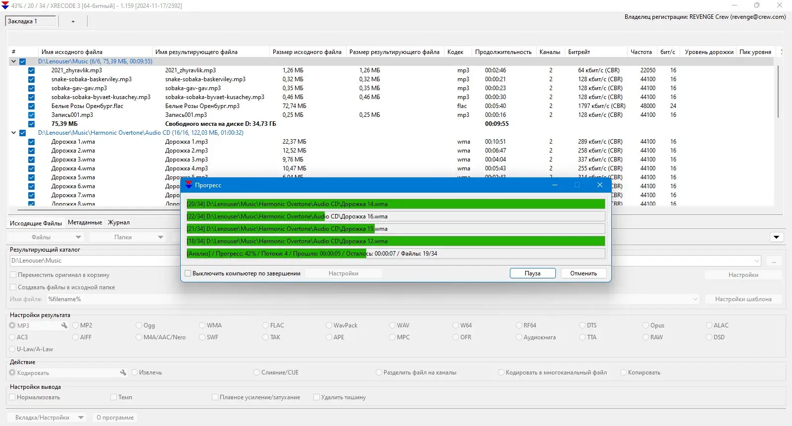 XRecode 3 сочетает в себе высокую производительность и гибкость настройки, что позволяет эффективно конвертировать аудиофайлы без потери качества. Программа поддерживает широкий спектр входных и выходных форматов, включая редкие и устаревшие типы, такие как RealAudio и модульные треки. Благодаря встроенной поддержке многопоточности, конвертация нескольких файлов происходит одновременно, задействуя все ядра процессора для максимальной скорости.