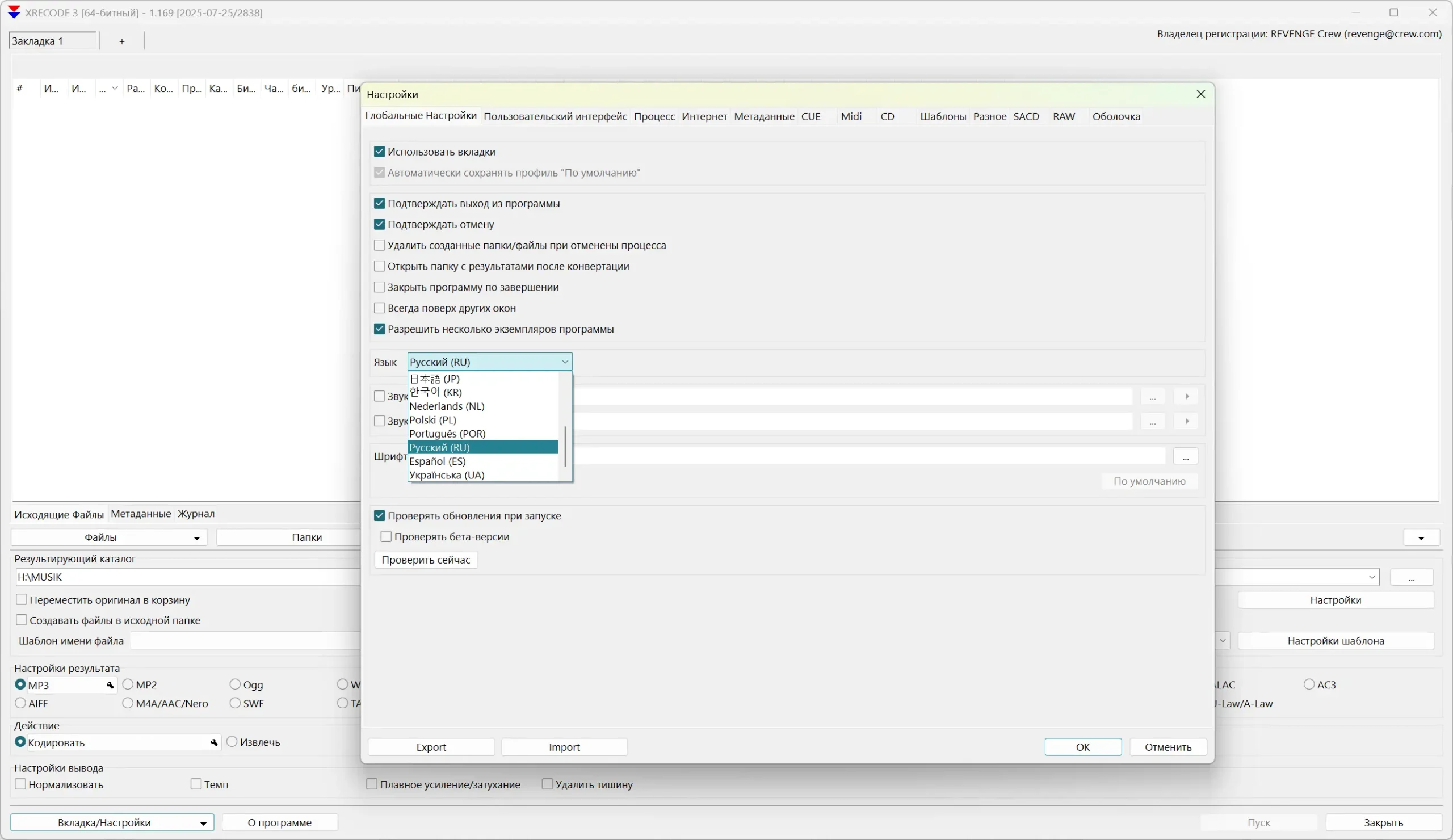 - Гибкие настройки кодеков для форматов FLAC, OGG, AAC, WMA и других, включая управление качеством и битрейтом.