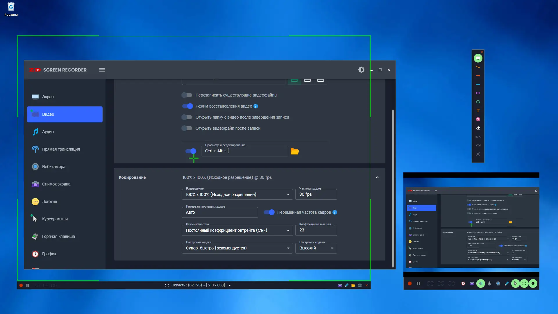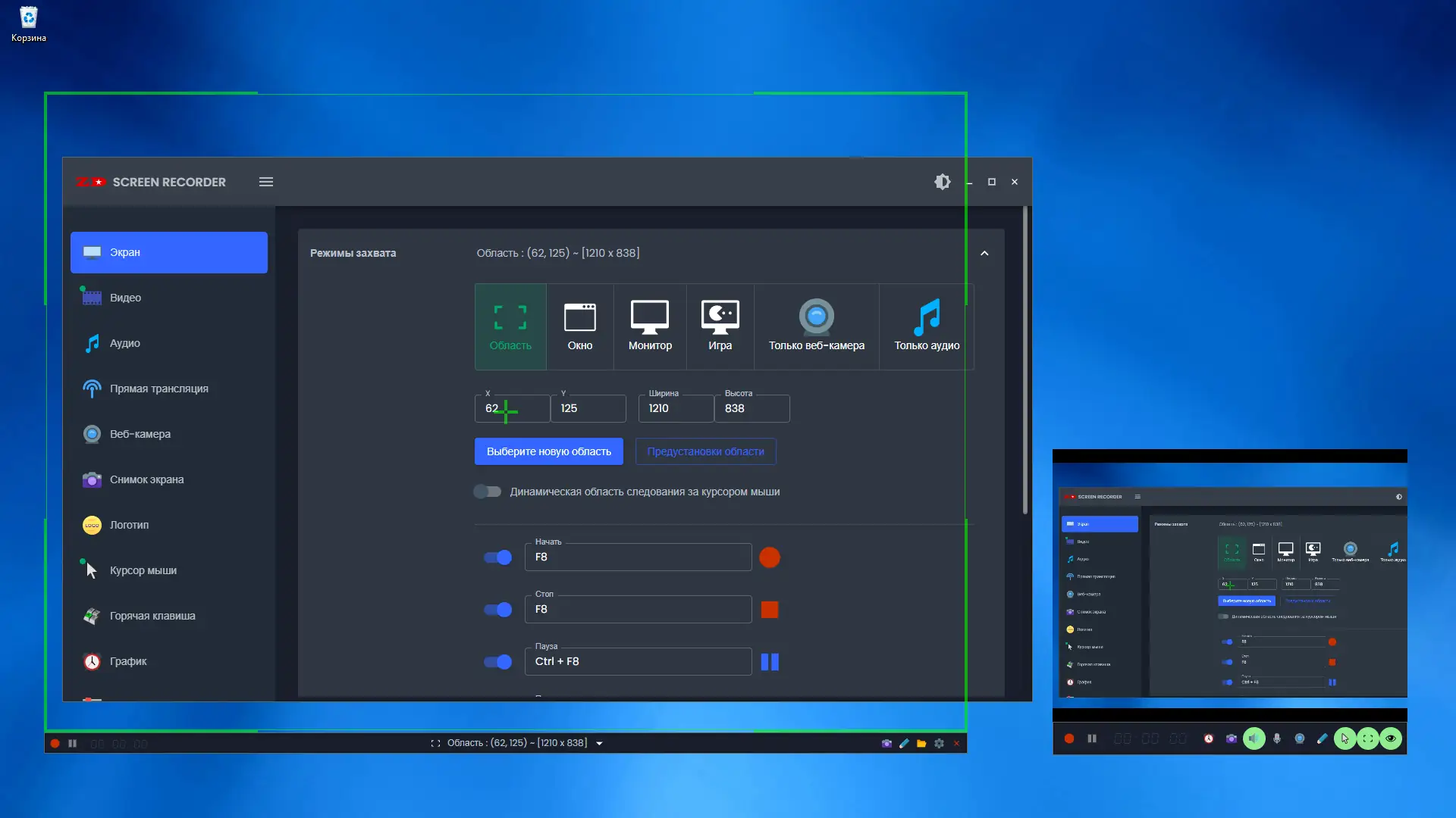 - Запись видео в полноэкранном, оконном режиме или в выделенной области экрана