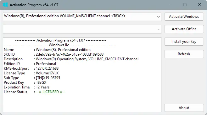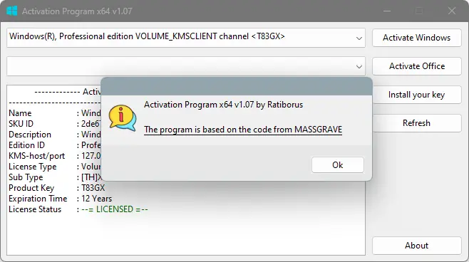 Программа предназначена для модификации лицензионного статуса операционных систем Microsoft через локальные изменения в системных компонентах. В основе лежит технология изменения данных в Trusted Storage, что позволяет обойти стандартные механизмы проверки лицензии. Используемый код частично основан на разработках группы MASSGRAVE, включая TSforge, что обеспечивает стабильность и совместимость с различными версиями Windows. Решение подходит для пользователей, которым требуется поддержка устаревших систем, таких как Windows 7 с ESU, без необходимости в постоянном подключении к серверам активации.