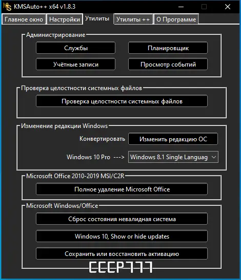 KMSAuto++ — это компактный и эффективный инструмент для автоматической активации операционных систем Windows версий VL и офисных пакетов Microsoft Office. Программа поддерживает широкий спектр продуктов, включая Windows от Vista до 11 и Office 2010–2019, обеспечивая стабильную работу через встроенный KMS-сервис. Подходит как для одноразового запуска, так и для настройки регулярной переактивации через планировщик задач.