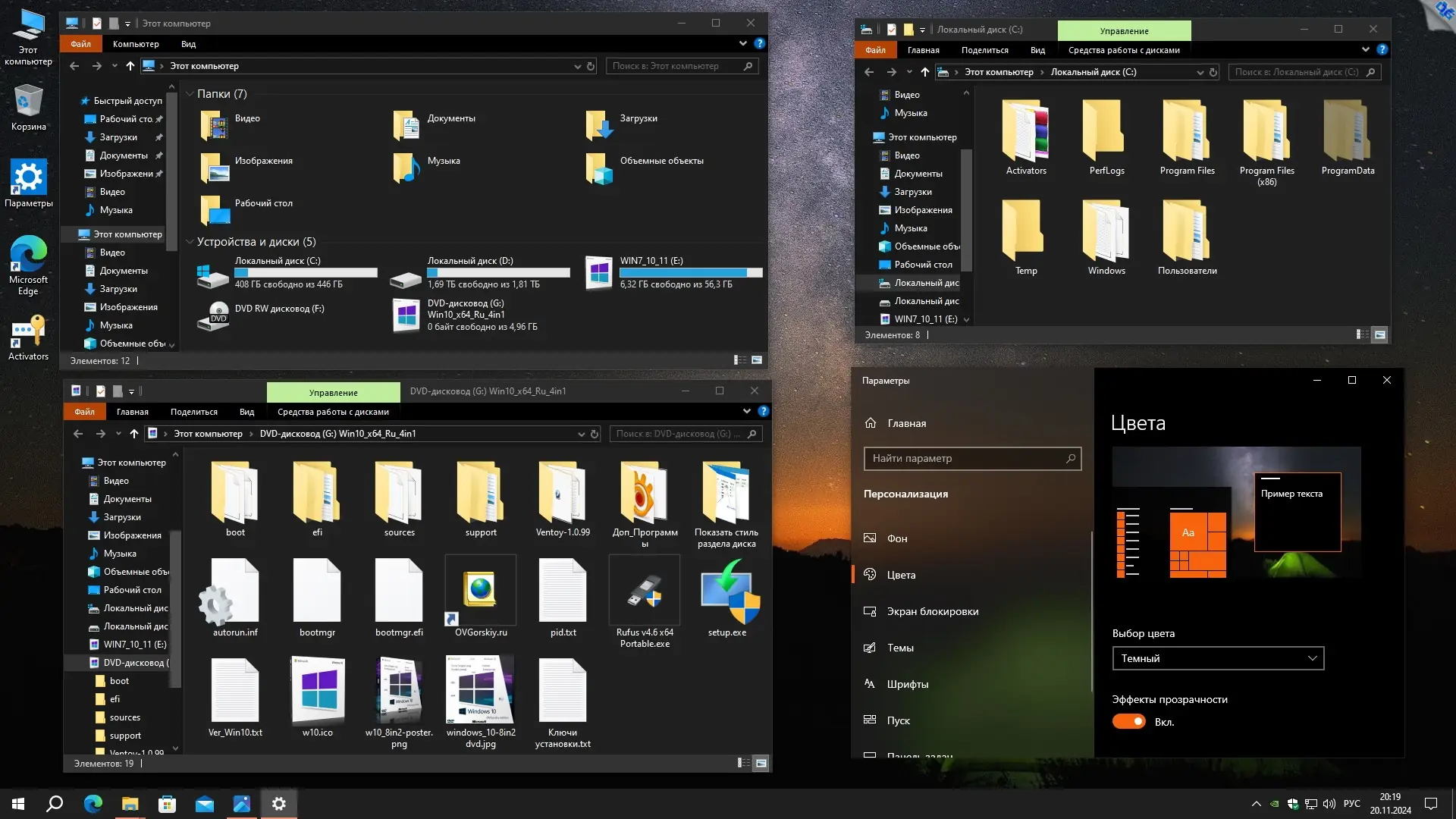 Представленный образ операционной системы основан на официальных дистрибутивах Microsoft для русскоязычного рынка и включает в себя несколько редакций Windows 10 22H2 в едином установочном файле. Сборка объединяет версии Core Home, Home Single Language, Professional и Enterprise, что делает её универсальной для различных задач — от домашнего использования до корпоративной среды. Все компоненты объединены с помощью стандартного инструмента Microsoft ADK — DISM, без нарушения целостности системных файлов. Образ актуализирован по состоянию на ноябрь 2024 года, включая все накопительные обновления, патчи безопасности и улучшения стабильности.