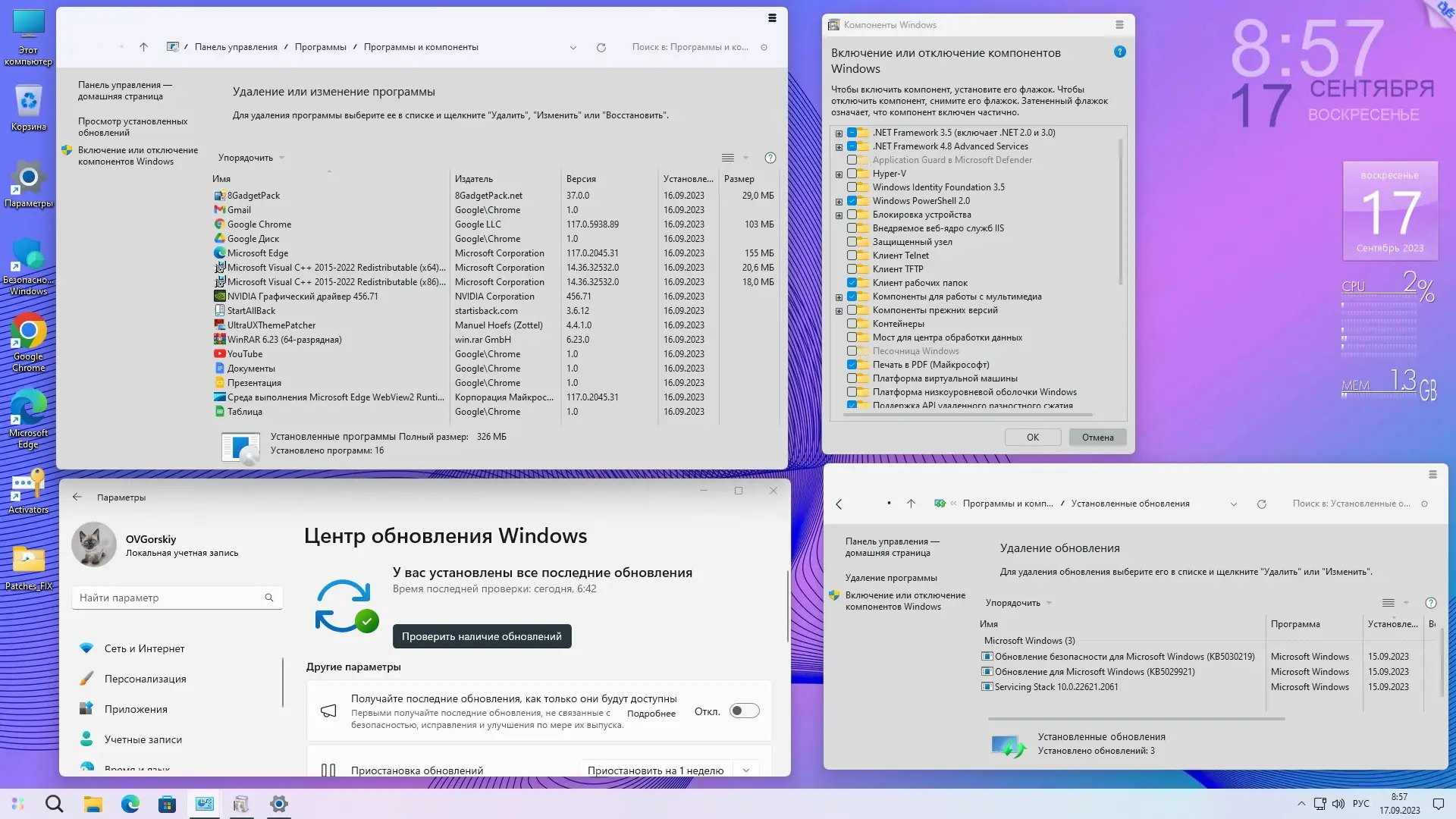 После установки система готова к использованию с минимальными настройками. Рекомендуется сразу активировать Windows с помощью встроенного KMS-активатора из папки Activators на диске C. Перед запуском активатора необходимо отключить антивирус и защитник Windows. Для персонализации интерфейса можно воспользоваться встроенными темами, а также настроить внешний вид меню «Пуск» и панели задач через StartAllBack. Дополнительные твики, такие как включение гибернации, UAC или SmartScreen, доступны через папку Patches_FIX на рабочем столе. Все действия выполняются локально, без вмешательства в системные файлы сторонними средствами.