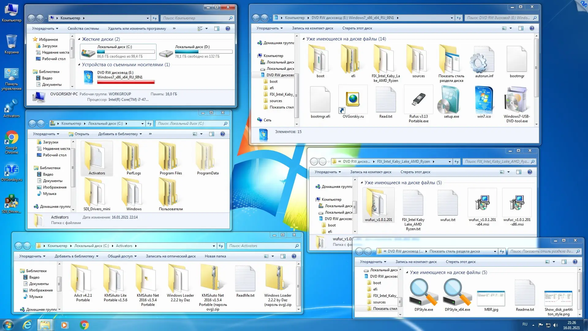 Для начала установки необходимо создать загрузочный носитель с использованием Rufus или Windows7-USB-DVD-Tool, учитывая тип разметки диска — MBR или GPT. На компьютерах с UEFI рекомендуется использовать Rufus с параметрами UEFI и FAT32. Перед записью образа следует отключить антивирус, чтобы избежать удаления компонентов. После загрузки с носителя пользователь выбирает нужную редакцию и разрядность системы, после чего начинается стандартный процесс установки с интеграцией всех включённых компонентов. После завершения установки система готова к использованию с минимальной дополнительной настройкой.