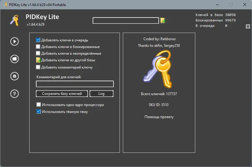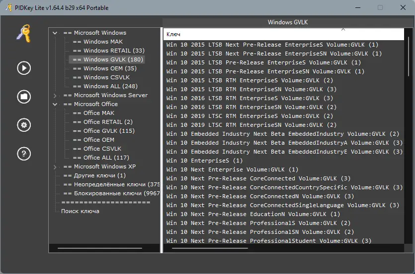 PIDKey Lite — это утилита для управления и хранения ключей активации продуктов Microsoft, позволяющая просматривать, обновлять и систематизировать лицензионные данные с использованием защищённой SQL-базы. Программа поддерживает ключи Windows и Office, обеспечивая удобный доступ к информации и инструментам проверки. Она совместима с современными версиями операционных систем и предлагает портативное использование без установки.