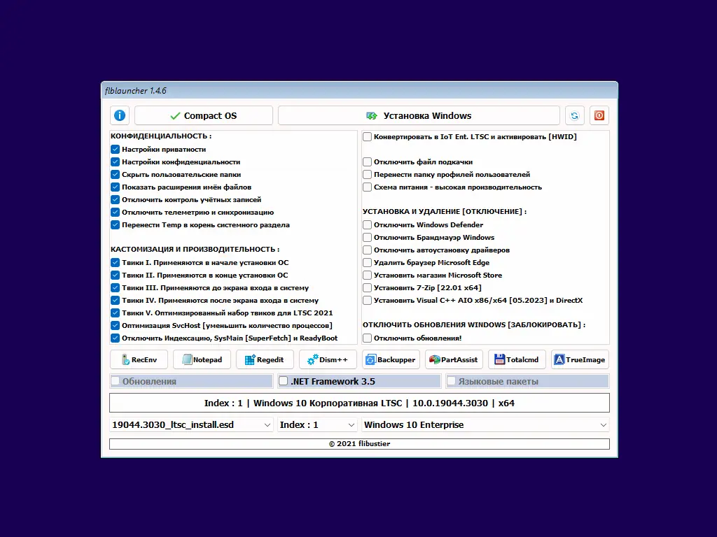 Операционная система построена на базе оригинального образа Windows 10 Enterprise LTSC 2021 x64, что гарантирует надёжность и совместимость с корпоративным программным обеспечением. В процессе подготовки образа использовался инструмент DISM, что позволило корректно интегрировать последнее накопительное обновление KB5026435 и упаковать систему в формат ESD для экономии места. Установка осуществляется через модифицированный лаунчер flblauncher 1.4.6 с дополнениями Mod 6, обеспечивающий быструю и гибкую настройку. Все этапы установки упрощены: выбраны языки, приняты лицензионные соглашения, введены ключи активации, отключены ненужные опции. Пользователю остаётся лишь выбрать диск для установки и задать имя учётной записи.