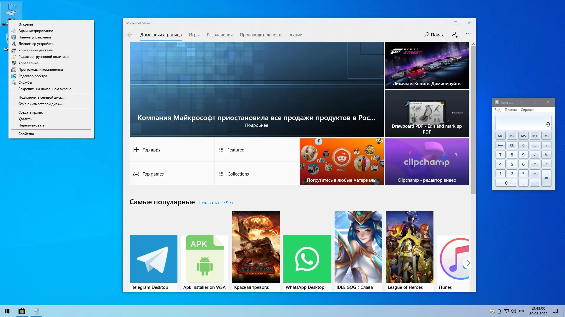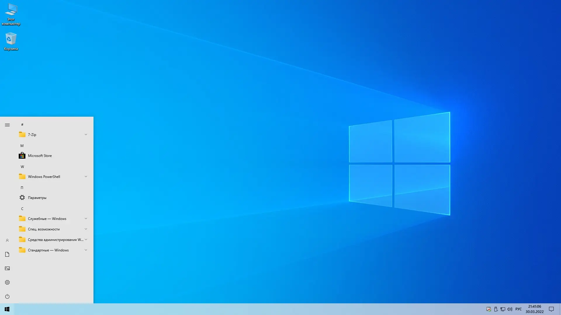 - Удалены современные приложения, кроме Магазина, включая Edge, OneDrive и Windows Defender