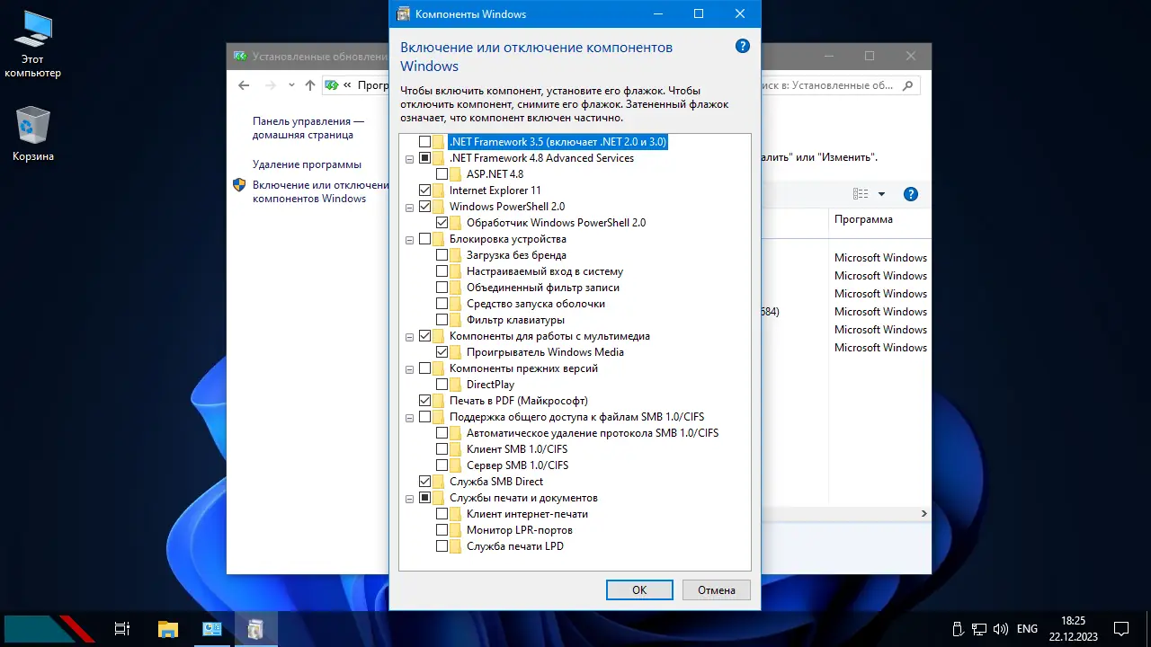 - Некоторые функции, такие как .NET 3.5, требуют интеграции на этапе установки, иначе их включение может быть ограничено