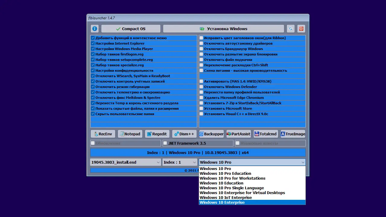 Установка осуществляется через полуавтоматический процесс с использованием flblauncher 1.4.7. На первом этапе пользователь выбирает раздел для установки, на последнем — имя учётной записи. Все остальные действия, включая принятие лицензий, выбор языка и ввод ключа, выполняются автоматически. Программы, такие как 7-Zip или StartIsBack++, устанавливаются тихо при наличии соответствующих галочек. Через конфигурационный файл flblauncher.ini можно добавить собственные кнопки, чекбоксы, изменить расположение файлов, цветовую схему и шрифты. Поддерживается установка с флешки, диска или прямо из смонтированного образа. Для пользователей WinPE доступны полезные утилиты: Acronis True Image, AOMEI Partition Assistant, Total Commander. Скрытая функция позволяет радикально очистить WinSxS, оставив около 100 Мб на x64-системе, что полезно для экономии места на SSD.