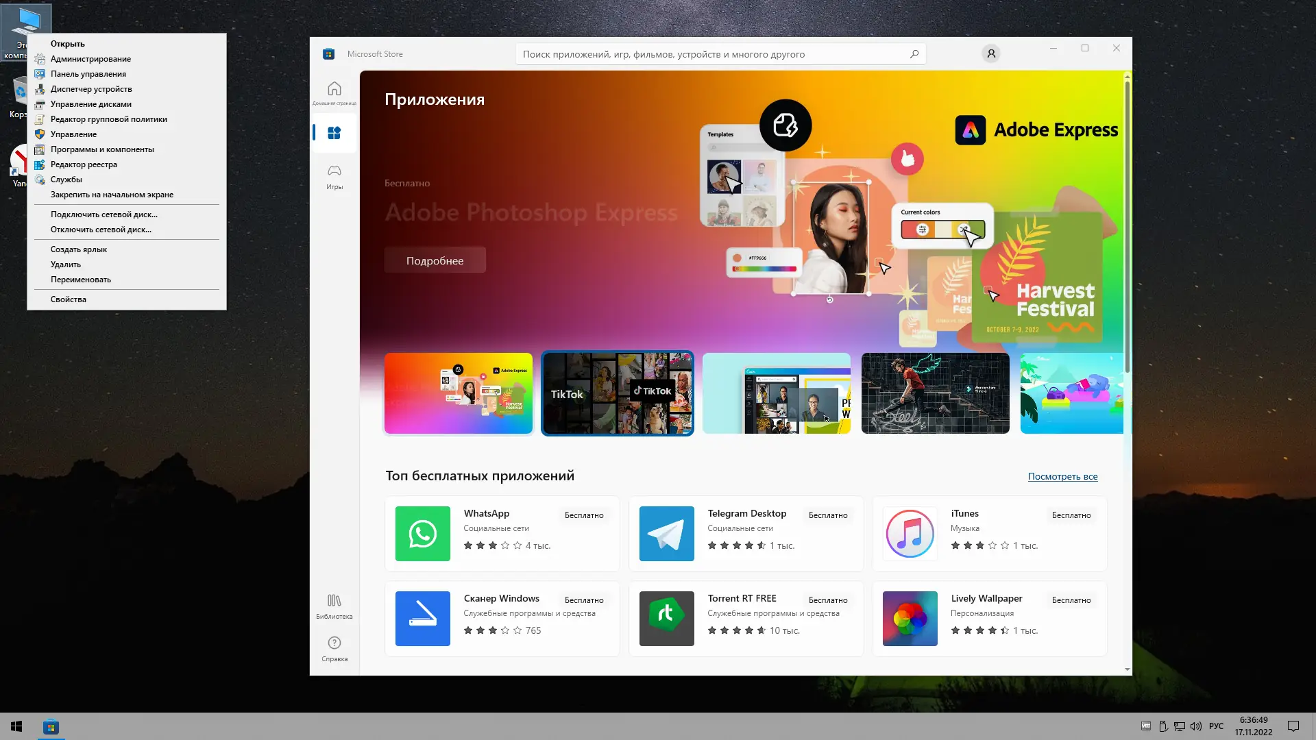 После установки система готова к использованию без дополнительной настройки. Через меню «Пуск» доступен переключатель для включения или отключения Защитника Windows. Для установки Microsoft Store достаточно запустить команду wsreset -i в PowerShell от имени администратора, после чего магазин загрузится автоматически. После установки магазина можно добавить Xbox через компоненты Xbox Identity Provider, Game Bar и основное приложение. При удерживании клавиши Shift в контекстном меню появляются дополнительные функции: установка .cab-пакетов и извлечение содержимого .msi-файлов. В меню «Этот компьютер» добавлены быстрые ссылки на диспетчер устройств, реестр, msconfig и другие инструменты администрирования. Пользователь может легко копировать или перемещать файлы через расширенное контекстное меню.