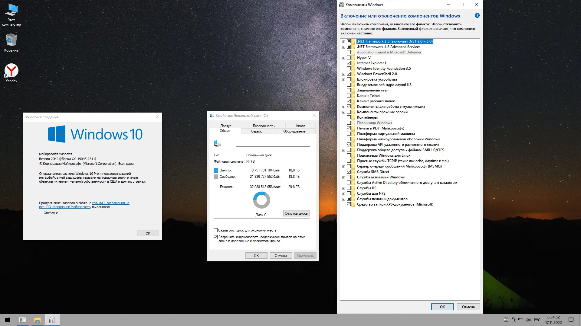 Операционная система построена на базе оригинального образа ru-ru_windows_10_business_editions_version_22h2_x64_dvd_61849fe8 с глубокой очисткой и настройкой под производительность. Удалены все современные приложения, включая Edge, Cortana и OneDrive, что освобождает ресурсы и ускоряет работу. Система поставляется в виде упакованного ESD-образа, что уменьшает объём и упрощает развёртывание через DISM. Все изменения направлены на повышение стабильности и приватности при сохранении полной функциональности. В системе отключена телеметрия, синхронизация и фоновые службы, не несущие критической нагрузки.