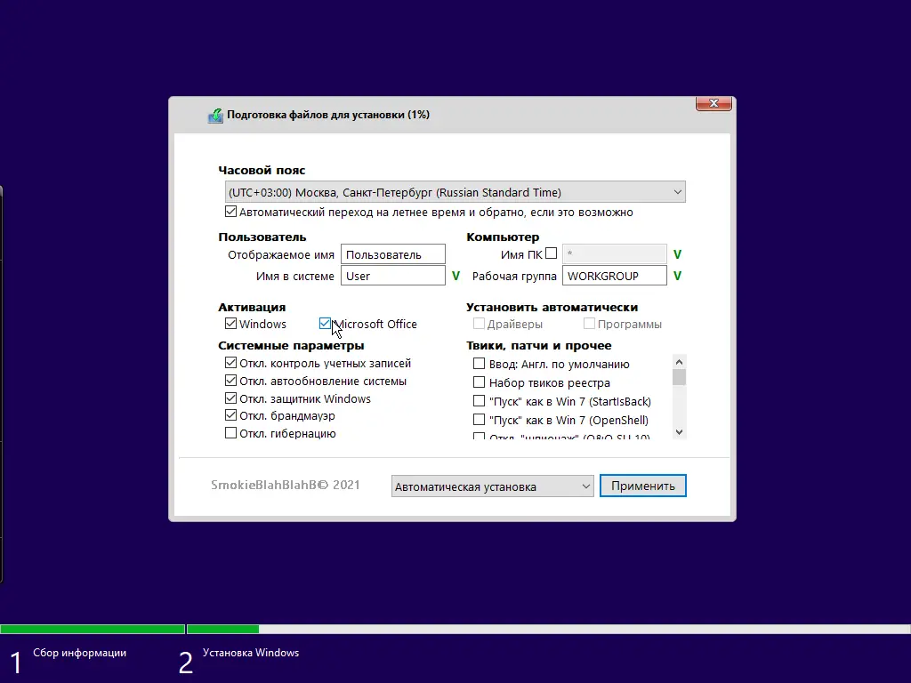 Установка осуществляется исключительно с загрузочного USB-носителя или DVD, с предварительной настройкой BIOS/UEFI. Для записи образа рекомендуются инструменты вроде Rufus или UltraISO, при этом файловая система носителя должна быть FAT32, несмотря на общий размер образа свыше4 ГБ — ограничение касается только отдельных файлов. Во время установки пользователь может выбрать нужную редакцию и активировать опции, такие как отключение шпионских функций, настройка меню «Пуск» в стиле Windows7 или установка Microsoft Store в LTSC-версии. После установки система автоматически активируется, если в BIOS присутствует подходящий ключ лицензии, или с помощью встроенного активатора.
