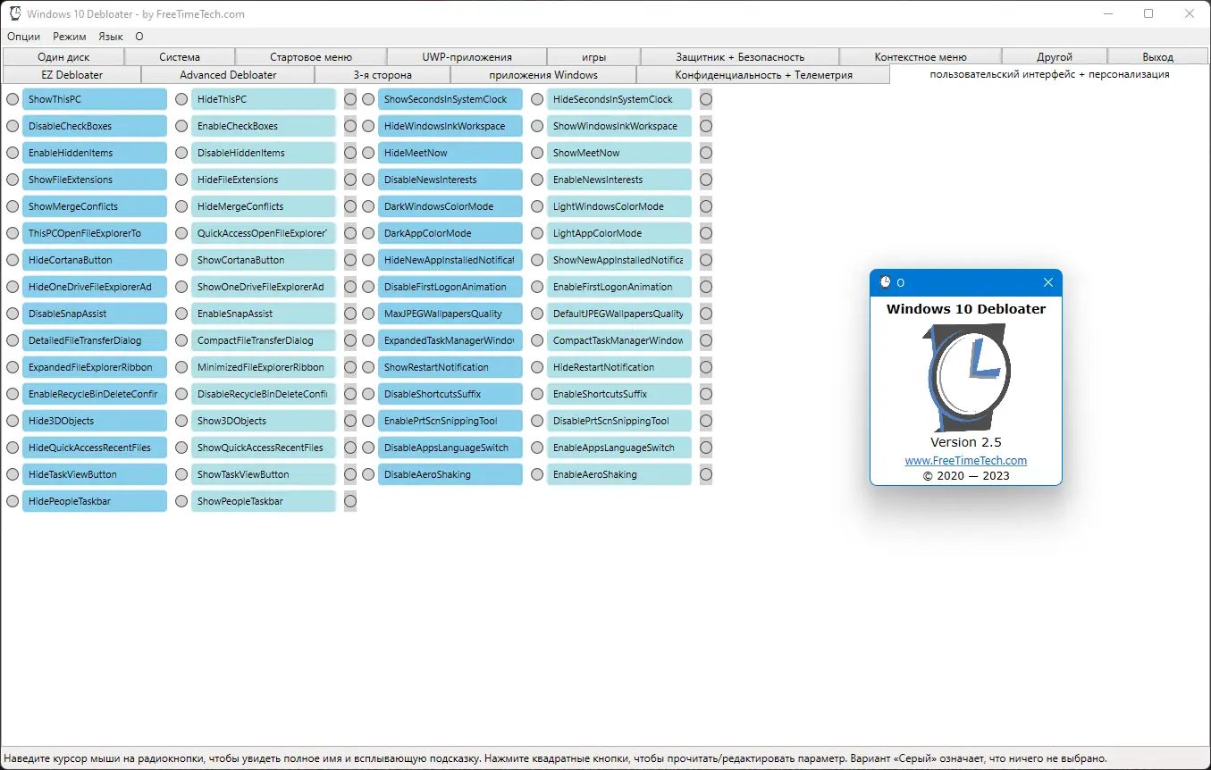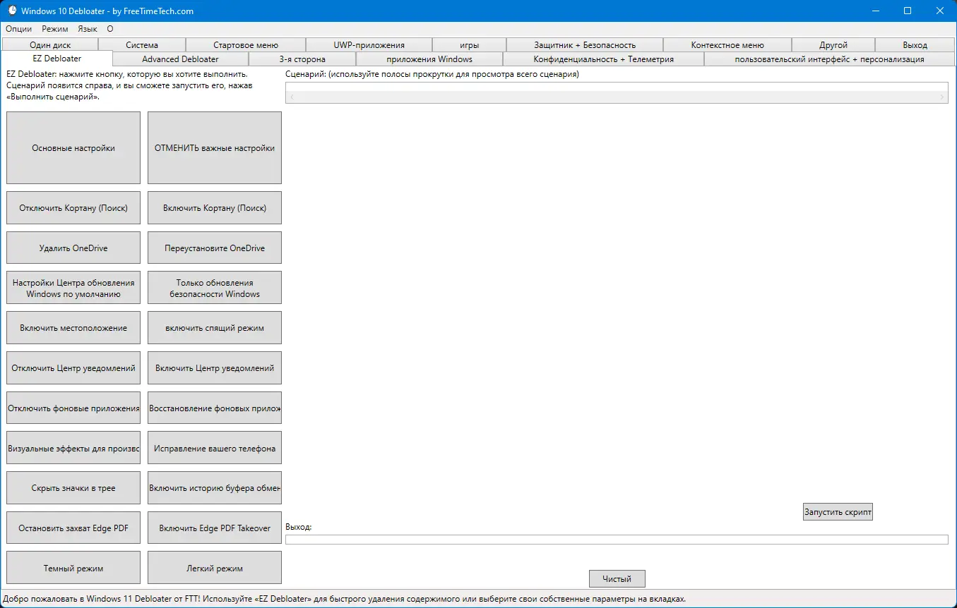 Программа создана на основе надежных скриптов с открытого репозитория github и объединяет функционал решений от Chris Titus Tech и farag2. Она позволяет гибко управлять компонентами операционной системы, включая предустановленные приложения и фоновые службы. Интерфейс разделён на вкладки, что упрощает навигацию и быстрый доступ к нужным функциям, таким как удаление bloatware, настройка конфиденциальности и модификация контекстного меню.