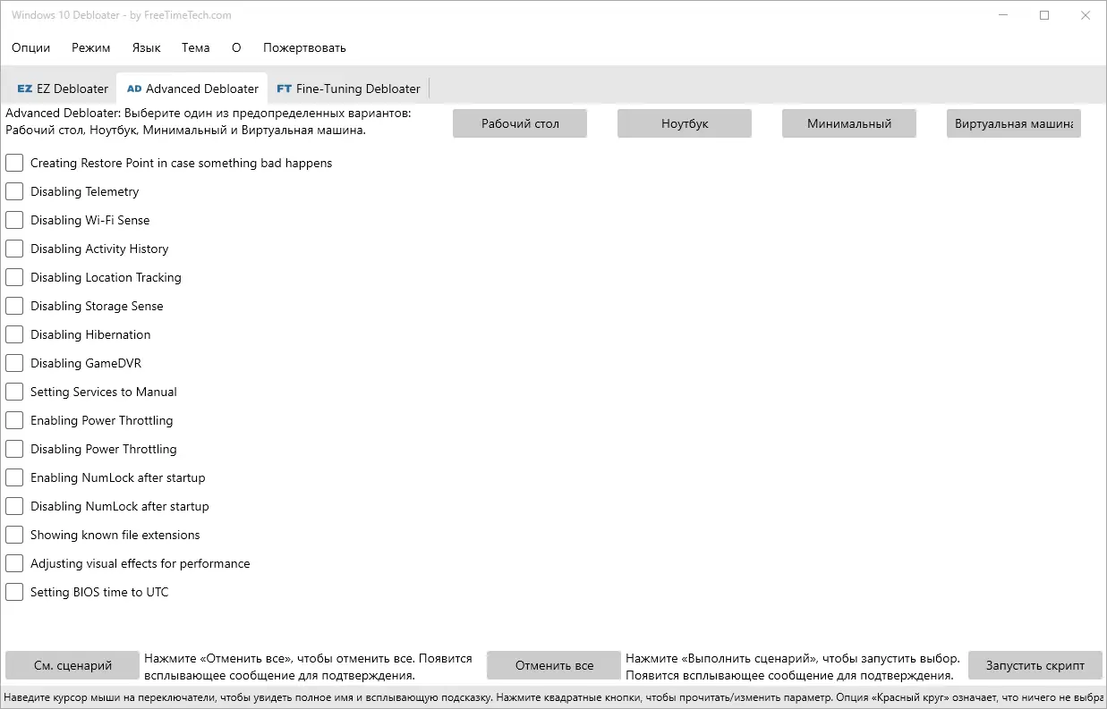 Debloater представляет собой инструмент, разработанный для тонкой настройки операционной среды. Он позволяет пользователю гибко управлять компонентами системы, включая встроенные приложения и фоновые службы. Интерфейс программы организован по принципу вкладок, что обеспечивает удобную навигацию между категориями функций, такими как удаление приложений, настройка приватности и управление телеметрией. Каждое действие сопровождается пояснением, указывающим, какой сценарий PowerShell будет запущен. Это повышает прозрачность процесса и снижает риски при внесении изменений в систему.