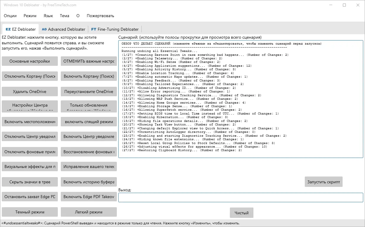 Программа представляет собой графическую оболочку для PowerShell-скриптов, разработанных сообществом, включая решения от Chris Titus Tech и farag2. Она позволяет провести тонкую очистку системы, удаляя ненужные компоненты, которые по умолчанию установлены в windows 10. Интерфейс разделён на вкладки: EZ Debloater, Windows Apps, Privacy & Telemetry, что упрощает навигацию и выбор нужных функций. Каждая опция сопровождается подсказкой, указывающей, какой именно скрипт будет запущен, что исключает случайное повреждение системы.