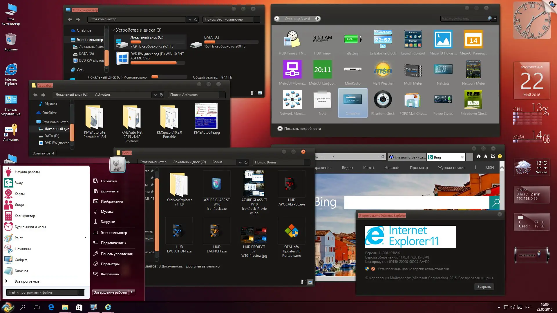 Процесс установки не отличается от стандартной процедуры развертывания Windows 10 с загрузочного носителя. Рекомендуется использовать флешку, записанную через Rufus в режиме UEFI для GPT-дисков или в классическом режиме для MBR. После запуска установки выбирается нужная разрядность, язык и тип установки — «Чистая». В ходе установки автоматически интегрируются встроенные приложения, включая StartIsBack++, UxStyle и 8GadgetPack. После первого входа в систему необходимо перезагрузиться для корректного применения настроек пользователя. Для настройки внешнего вида рекомендуется запустить OldNewExplorer и активировать нужную тему через подменю «Персонализация+» на рабочем столе. Язык системы меняется в Панели управления через раздел «Язык», где можно установить приоритетный интерфейс и применить его ко всем компонентам системы, включая экран приветствия. Активация возможна с помощью KMSAuto Lite Portable, расположенного в папке Activators на диске C: после установки.