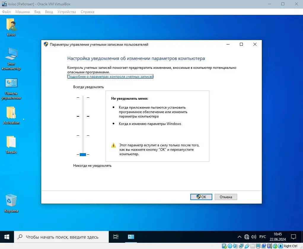 - Отключён UAC для упрощения административных задач