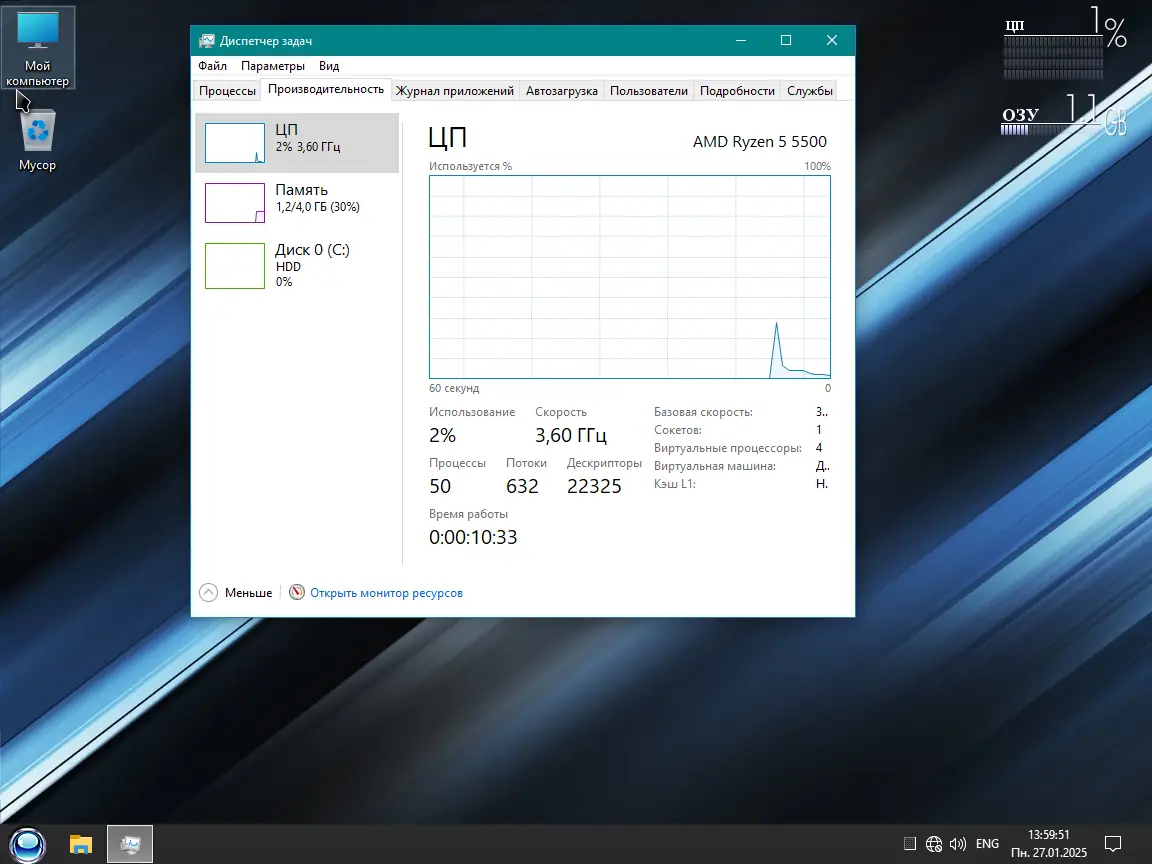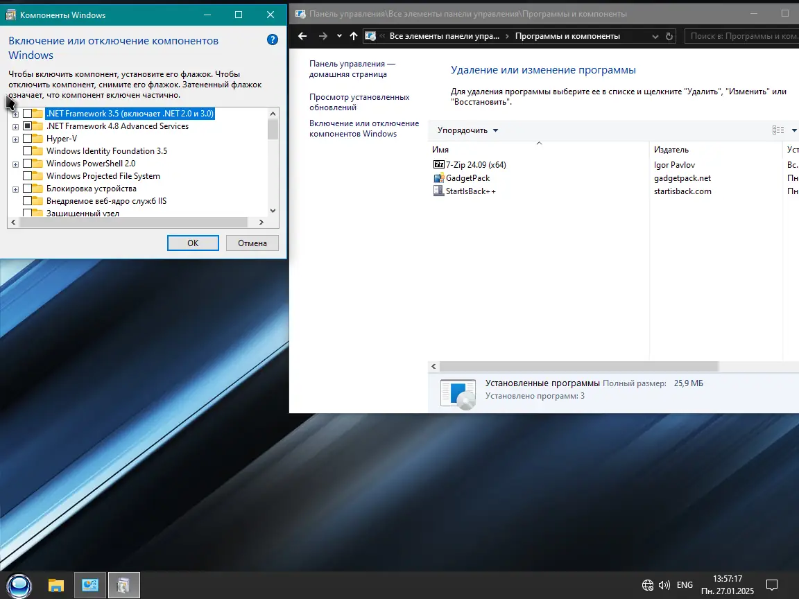 - Установлены дополнительные компоненты: .NET Framework 4.8, 7Zip 24.09, Cent Browser Portable, GadgetPack, Startisback