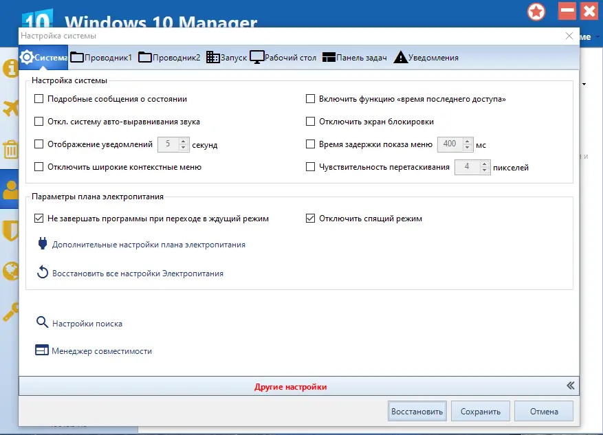 - Возможность тонкой настройки автозагрузки, реестра, сетевых параметров и внешнего вида интерфейса.