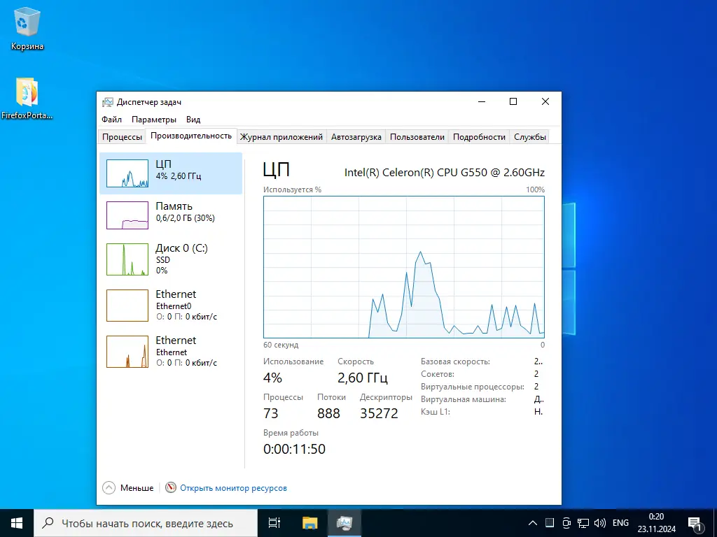 После установки операционная система запускается в стандартном режиме с минимальным набором изменений в поведении. На рабочем столе присутствует ярлык FireFoxPortable — портативная версия браузера, позволяющая загрузить любую альтернативу. Пользователь может установить Chrome, Opera или другой браузер по своему усмотрению, после чего удалить временный браузер. Для тех, кто хочет использовать Microsoft Store, в образе предусмотрена папка Add-MicrosoftStore-Rs с командным файлом, который восстанавливает магазин приложений.