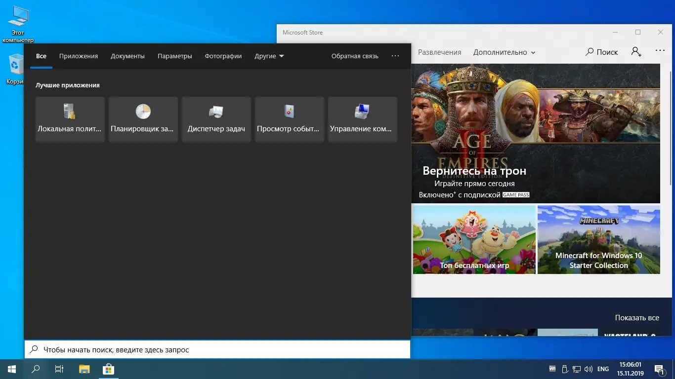 - Удалены все Modern-приложения, кроме Microsoft Store и поиска, что ускоряет работу системы и снижает нагрузку на ресурсы компьютера.