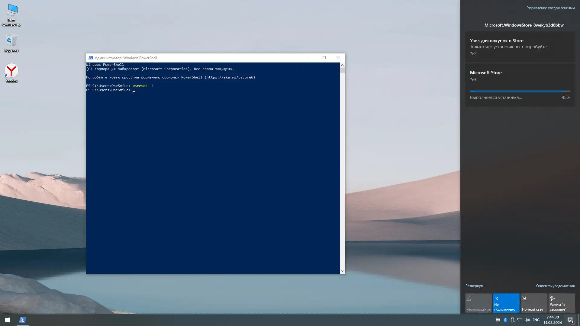 После установки система не требует дополнительной настройки — все оптимизации уже применены. Для включения или отключения Защитника Windows используется встроенный переключатель в меню «Пуск», после чего требуется перезагрузка. При необходимости можно установить Microsoft Store и Xbox через команду wsreset -i в PowerShell с правами администратора, при условии подключения к интернету.