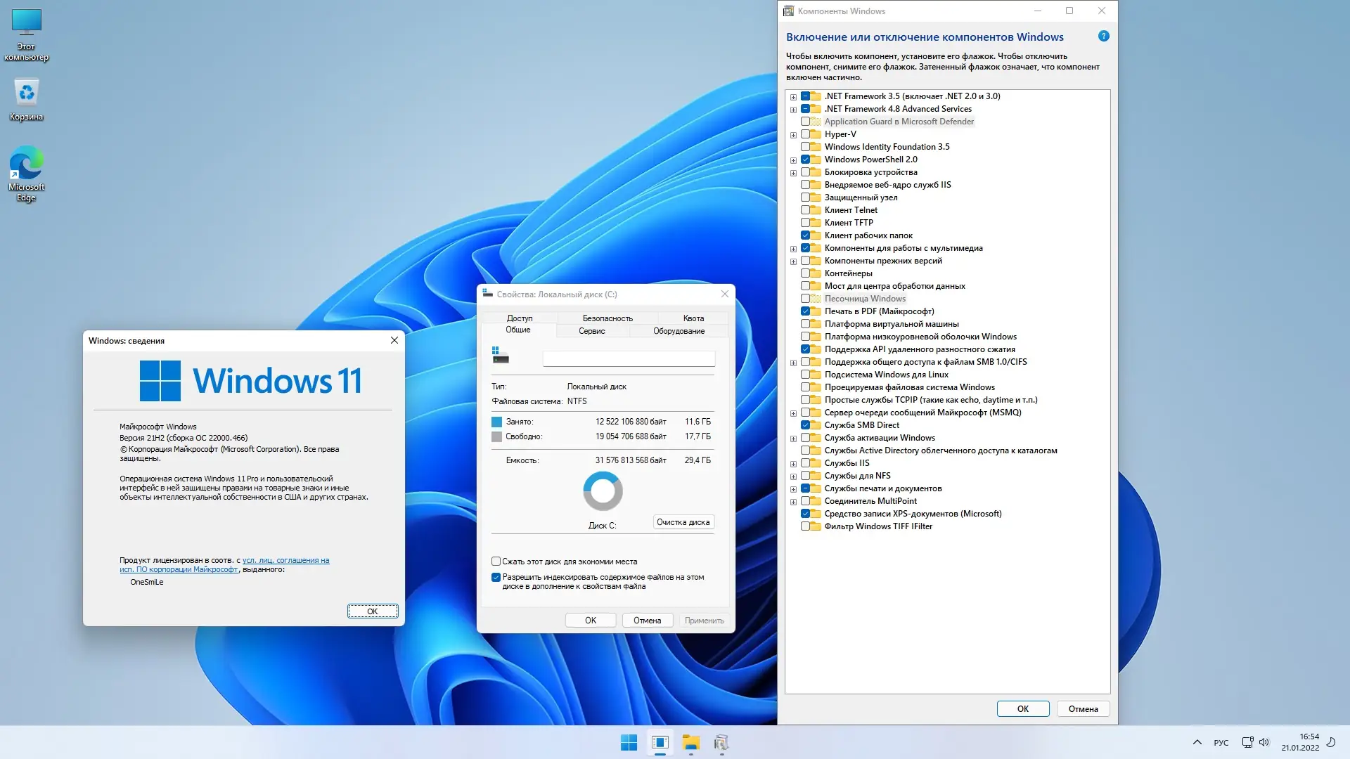 Сборка основана на официальном образе ru-ru_windows_11_business_editions_updated_dec_2021_x64_dvd_76ce2854, что гарантирует стабильность и совместимость с современным программным обеспечением. В системе оставлен только браузер Edge, все остальные модерн-приложения удалены для повышения производительности и снижения нагрузки на ресурсы. Антивирус Windows Defender включён по умолчанию, а его состояние можно быстро изменить через контекстное меню кнопки Пуск. Система включает две редакции — Windows 11 PRO и Windows 11 Enterprise, что расширяет возможности настройки и управления.